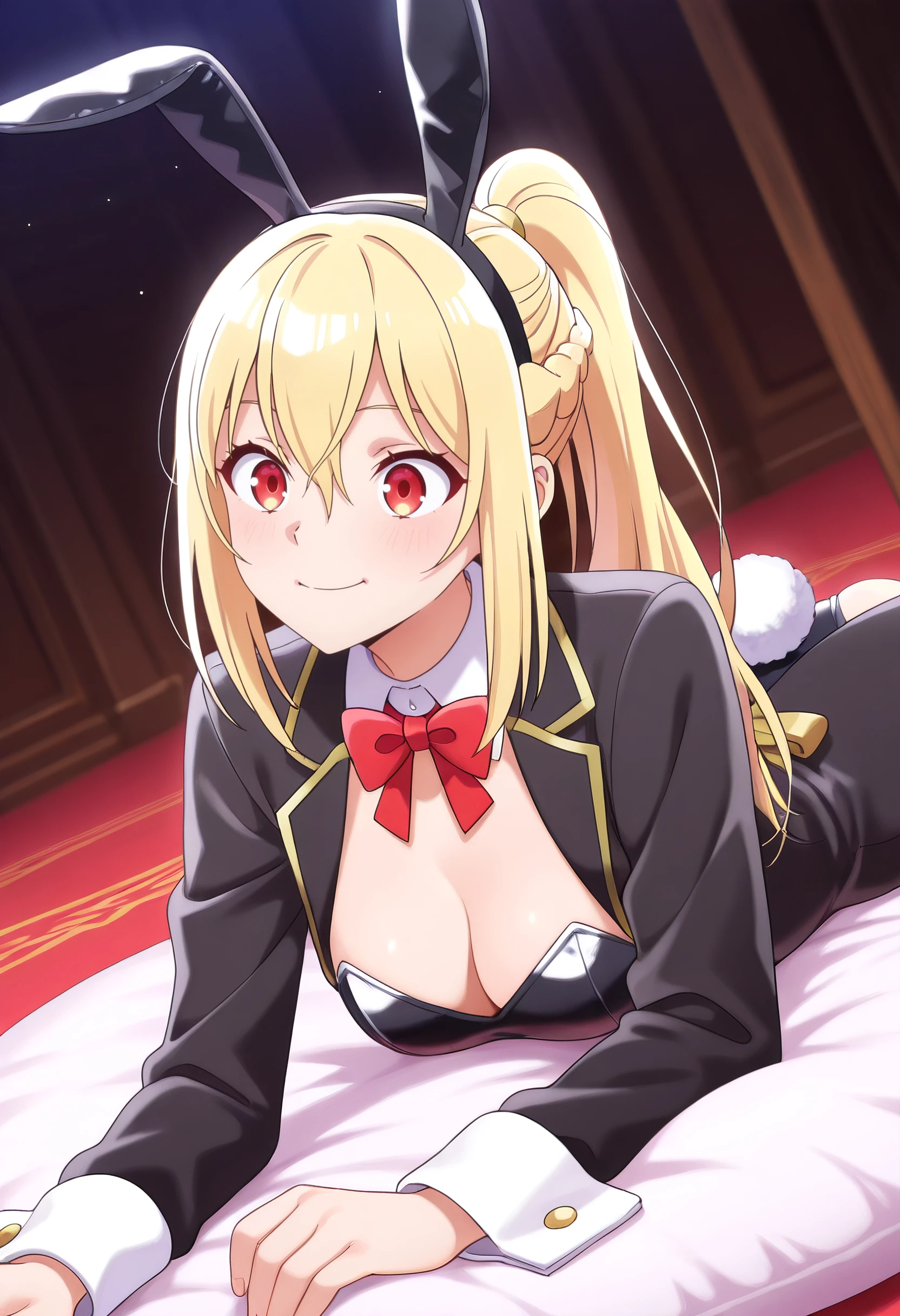 LenaBunny, rabbit ears, animal ears, black jacket, jacket, braid, hairband, playboy bunny, ponytail, fake animal ears, bowtie, red bow, bow, red bowtie, long sleeves, rabbit tail, sidelocks, black hairband, leotard, black leotard, detached collar, cleavage, strapless leotard, strapless, tailcoat, coattails, wrist cuffs, tail, fake tail,