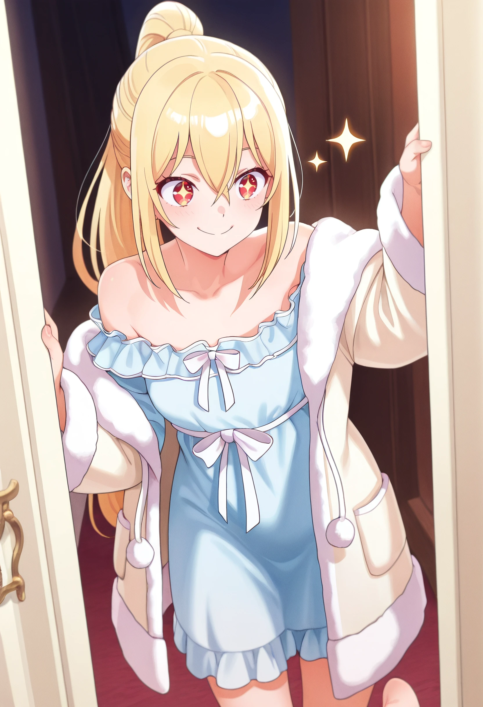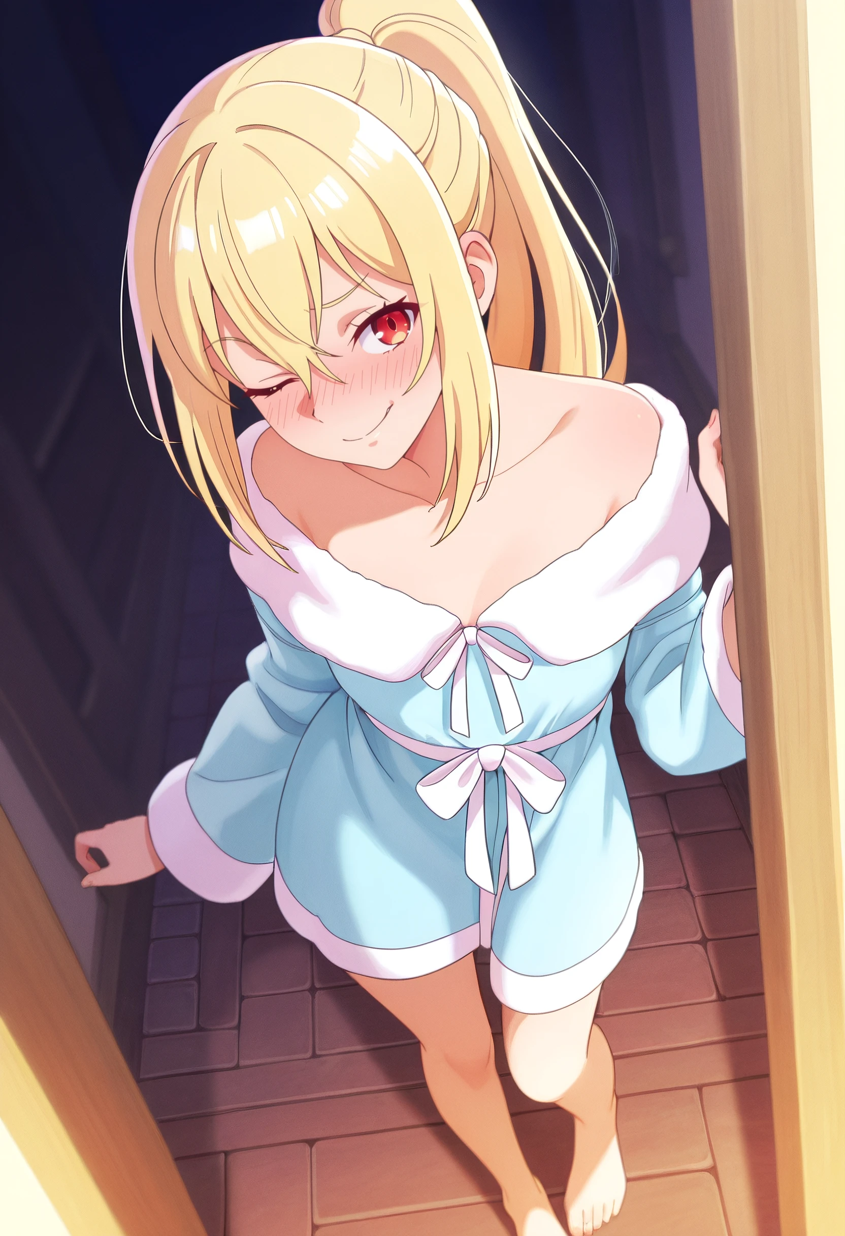 LenaCasual, ponytail, long sleeves, dress, sleepwear, nightgown, sidelocks, coat, white nightgown, off shoulder, barefoot, bathrobe, white ribbon, pajamas, bare legs, white bow, white capelet, crossed bangs, blue dress,