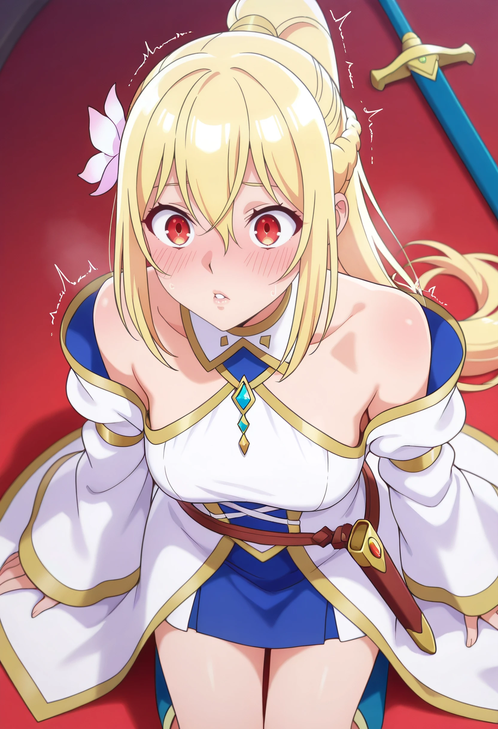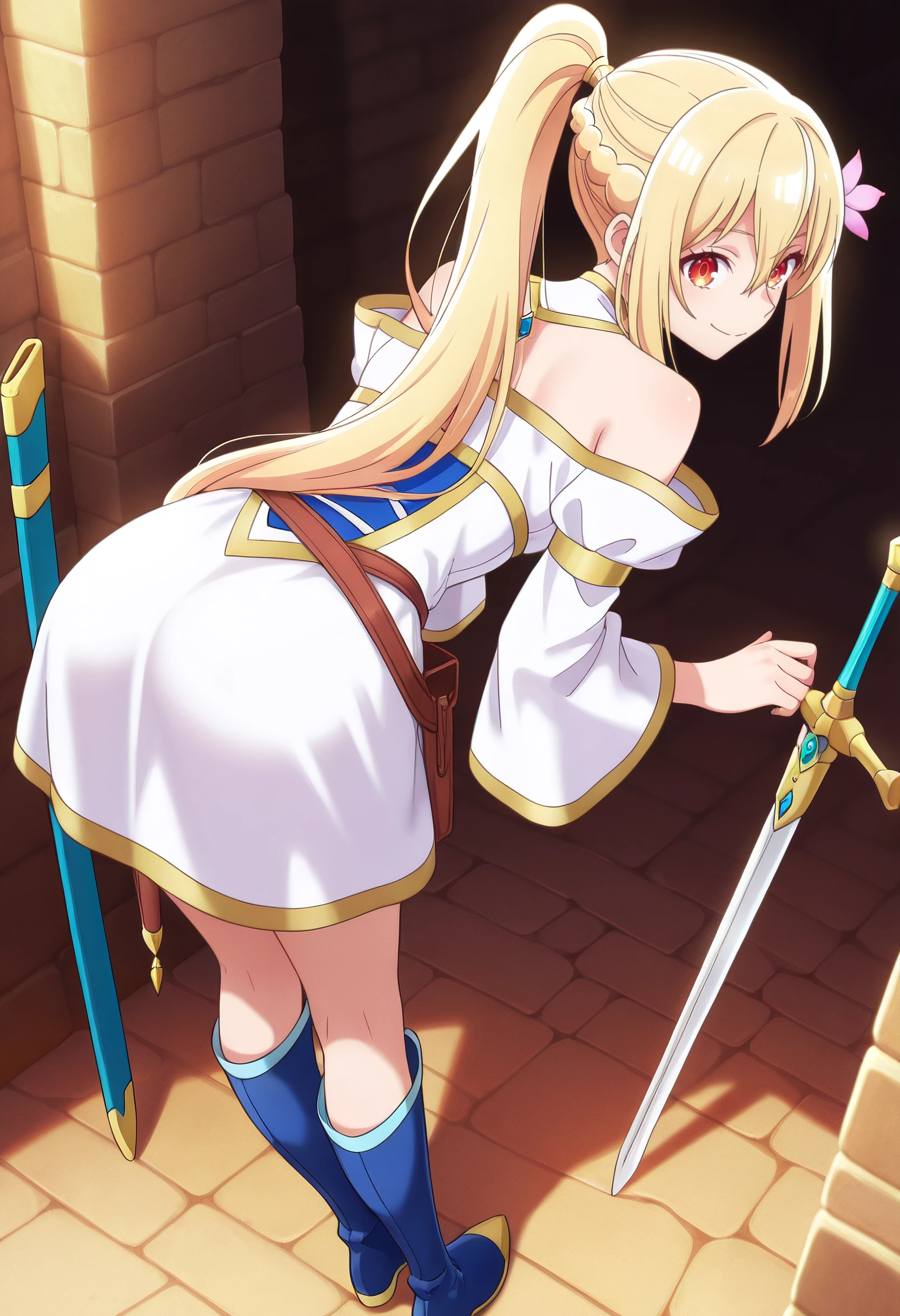 LenaOutfit, braid, ponytail, bare shoulders, detached sleeves, hair ornament, dress, hair flower, flower, white sleeves, white dress, french braid, sidelocks, long sleeves, sword, crown braid, wide sleeves, sheath, half up braid, sheathed, very long hair, boots, blue footwear, off-shoulder dress, knee boots, off shoulder,