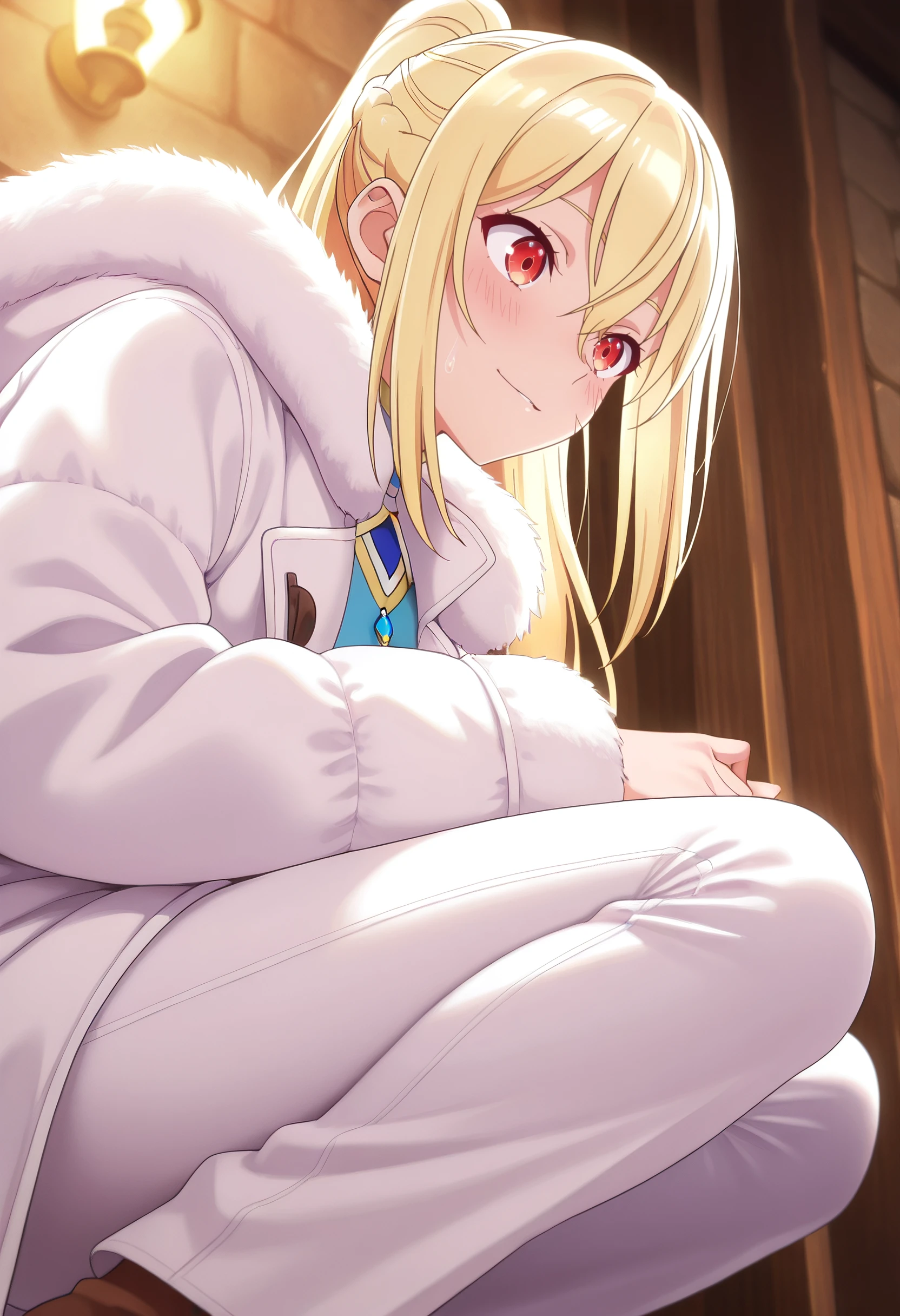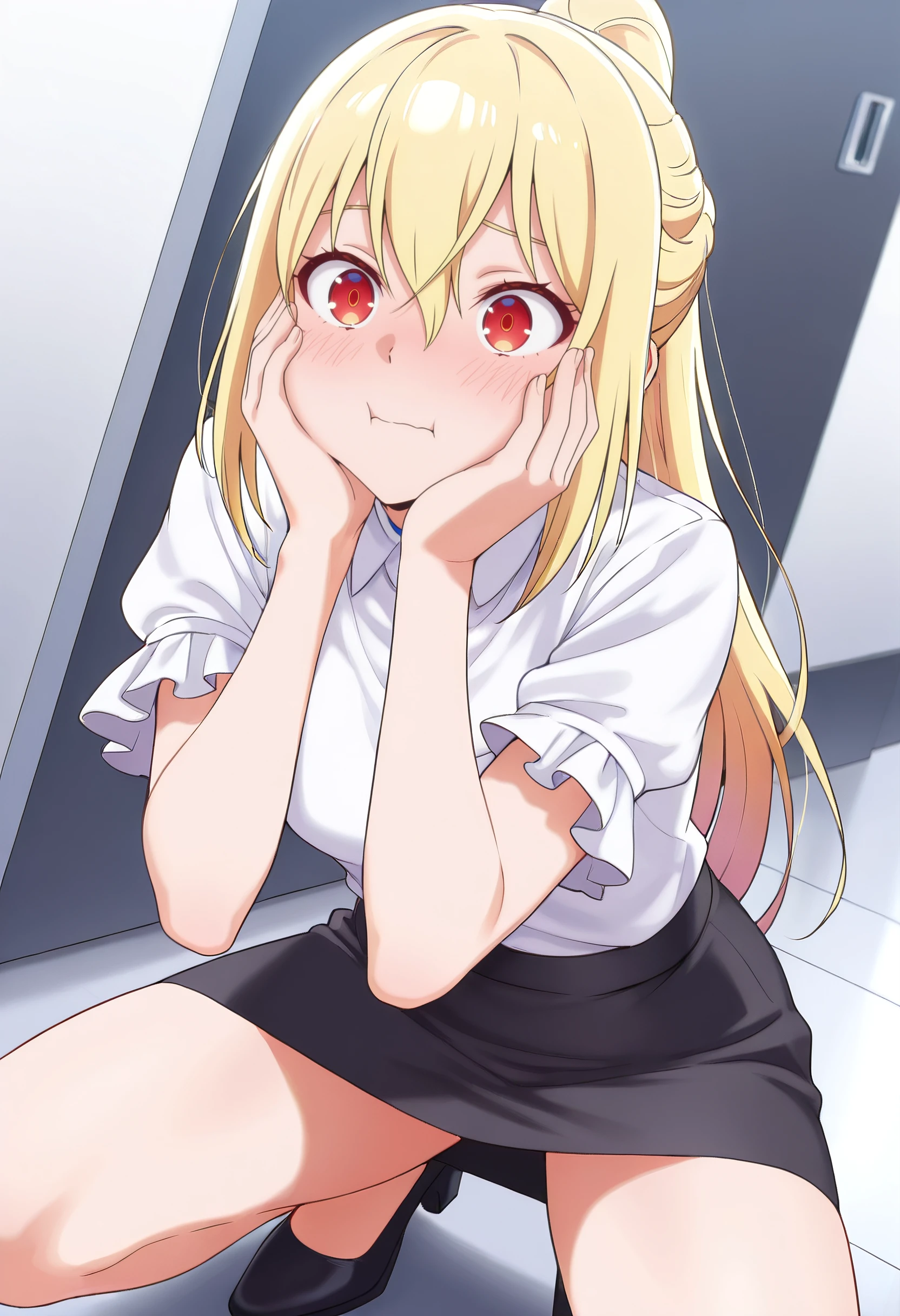 KMaLena, blonde hair, long hair, hair between eyes, red eyes,