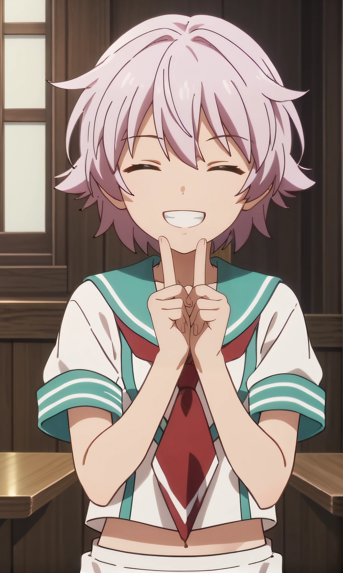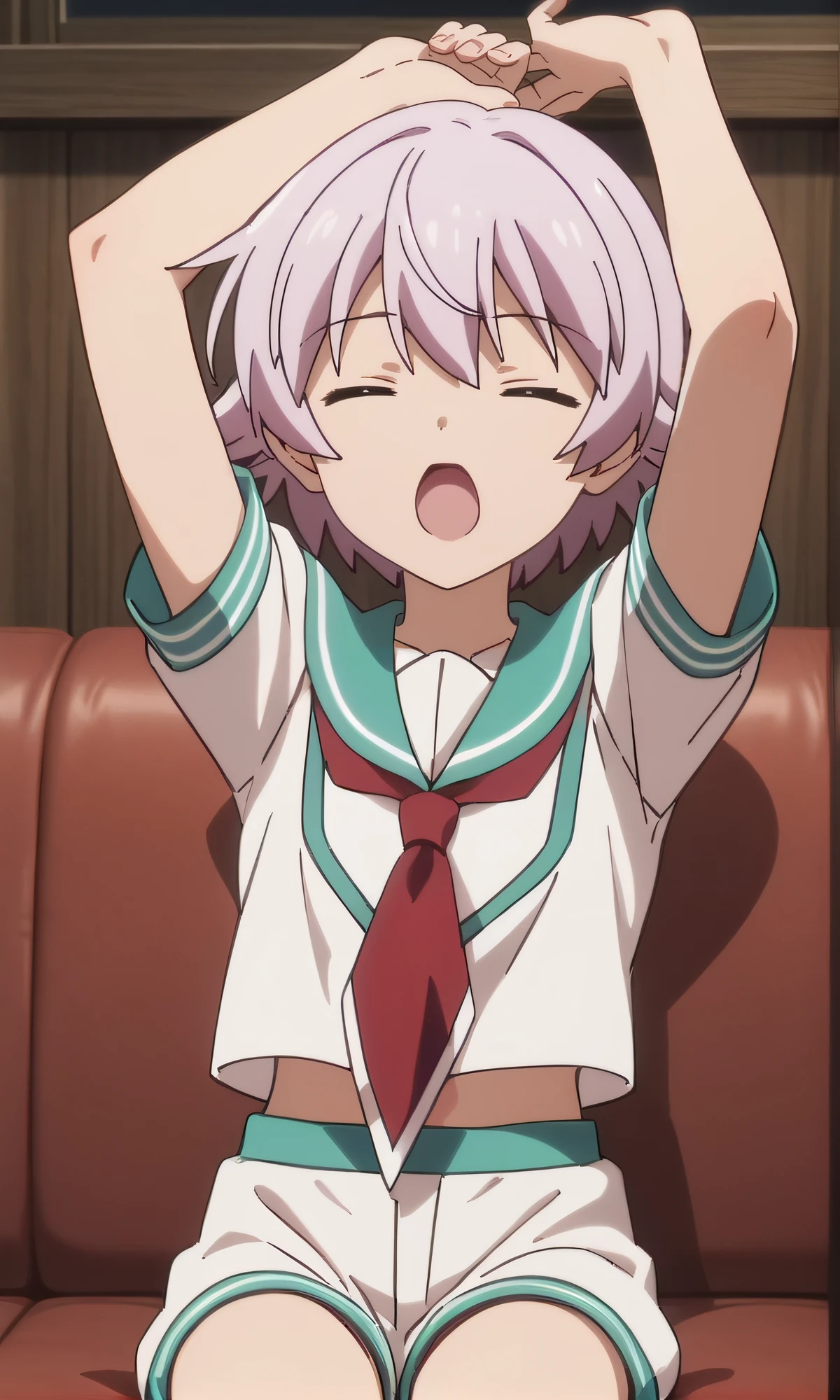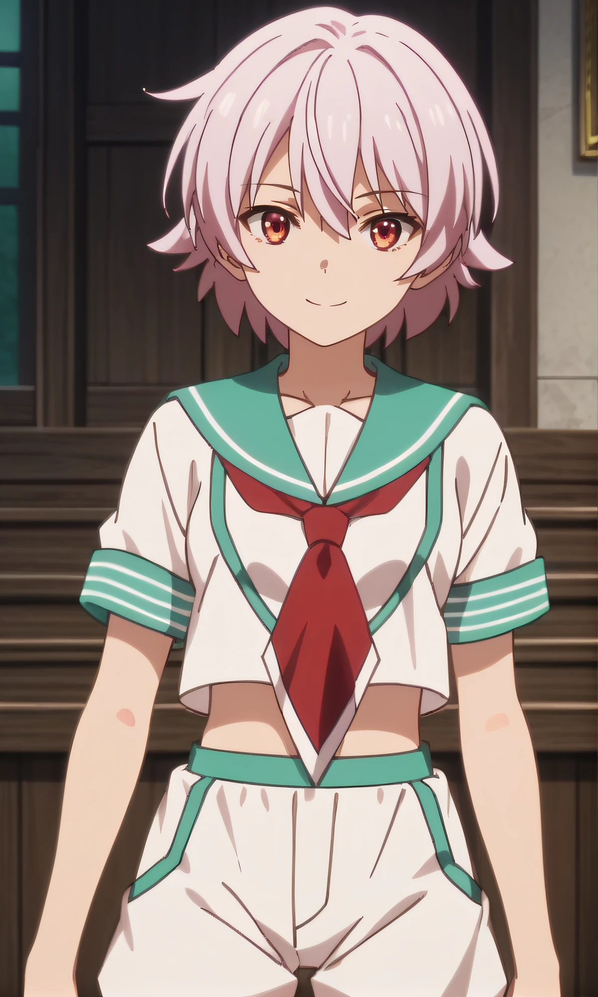 tama, short hair, red eyes, serafuku, navel, short sleeves, white shorts
