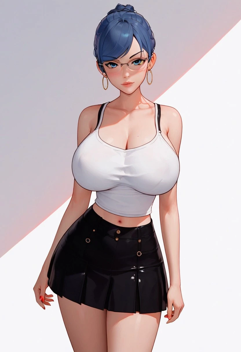1girl, Mil@, single hair bun, blue hair, blue eyes, large breasts, big ass, slim waist, long legs, gold hoop earrings, glasses,