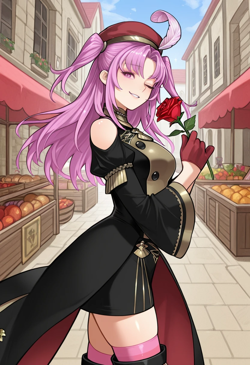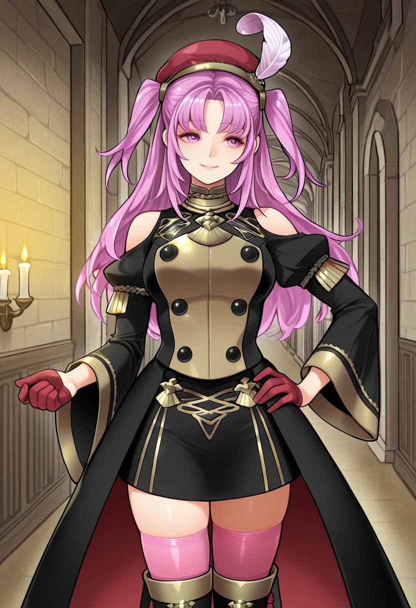 Trigger Words (Outfit): red beret, hat feather, garreg mach monastery uniform, black jacket, gold trim, bare shoulders, juliet sleeves, wide sleeves, half gloves, red gloves, black buttons, long jacket, black skirt, short skirt, zettai ryouiki, pink thighhighs, knee boots, black boots,