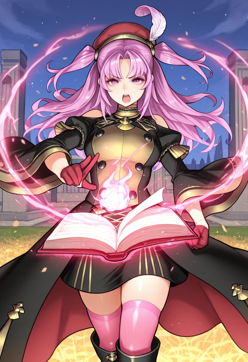 red beret, hat feather, garreg mach monastery uniform, black jacket, gold trim, shoulders, juliet sleeves, wide sleeves, half gloves, red gloves, black buttons, long jacket, black skirt, short skirt, zettai ryouiki, pink thighhighs, knee boots, black boots,