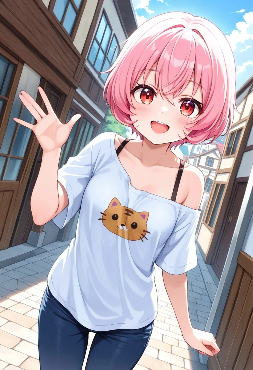 Hina,pink_hair, short_hair, red eyes, small breasts, petite, short body,