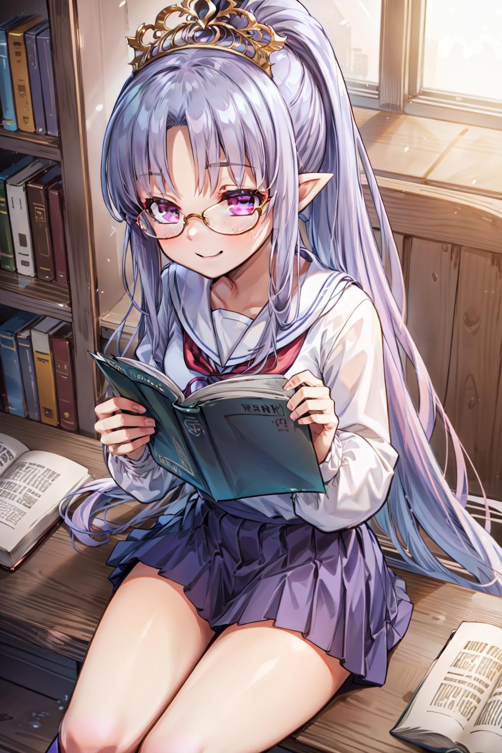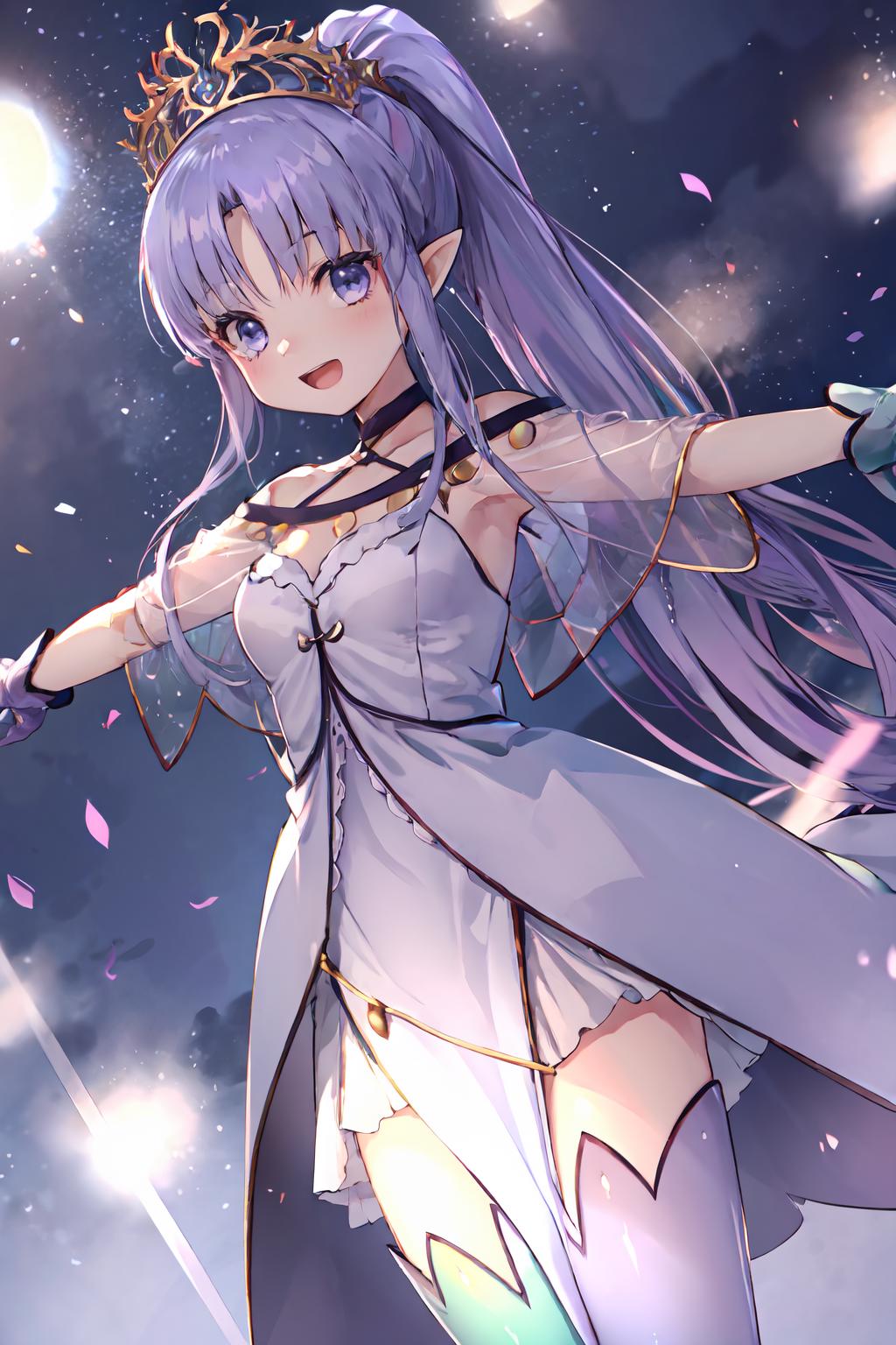 a close up view showing a character with long blue hair, 1girl, solo, pointy ears, long hair, gloves, thighhighs, blue eyes, staff, ponytail, dress,
