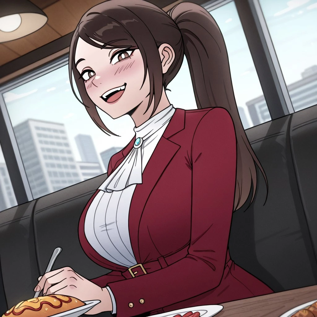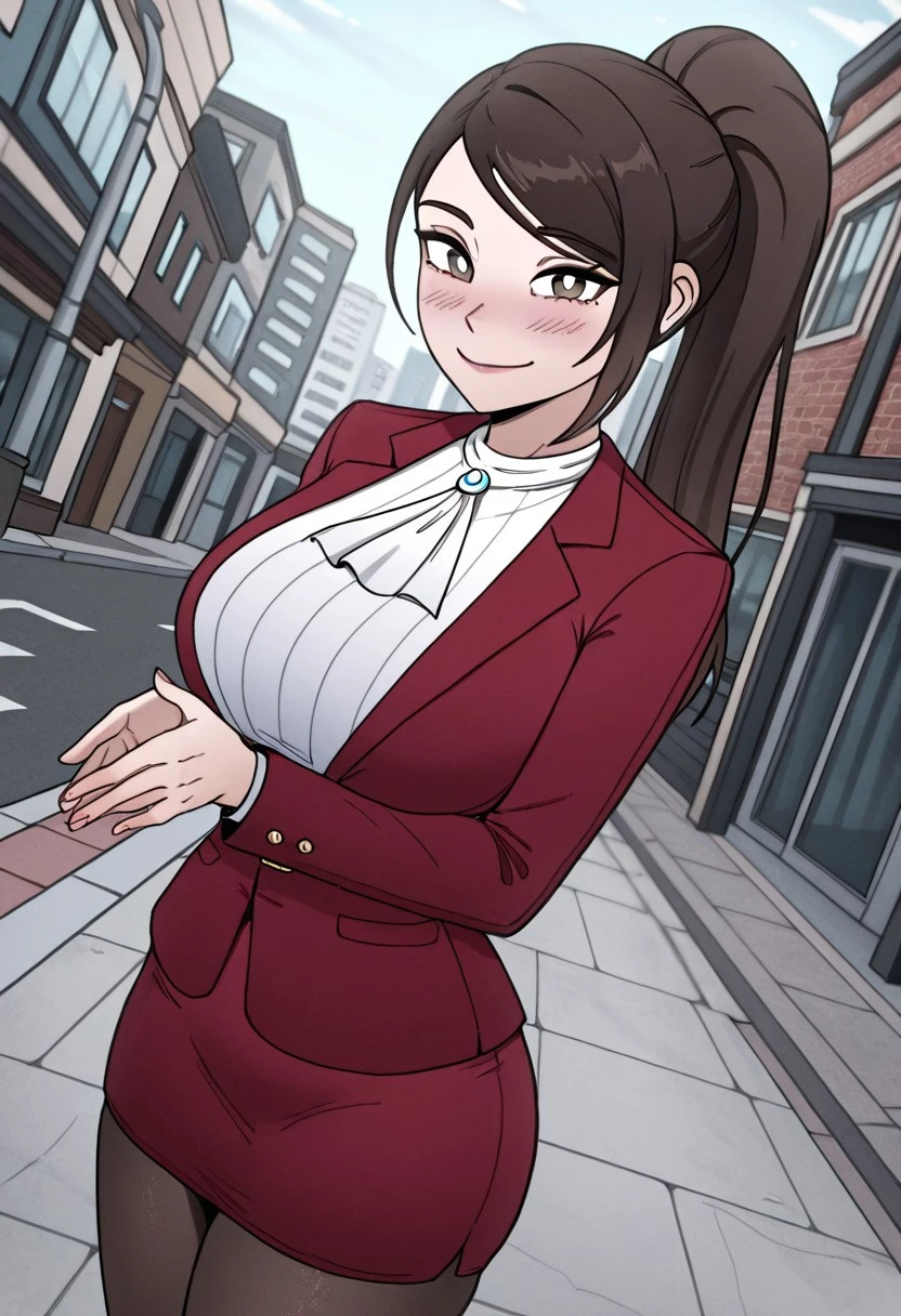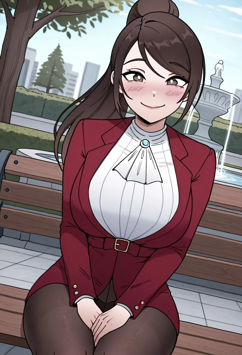 junexl, brown hair, brown eyes, white pupils, ponytail, long hair, jabot, white shirt, large breasts, red jacket, pantyhose,