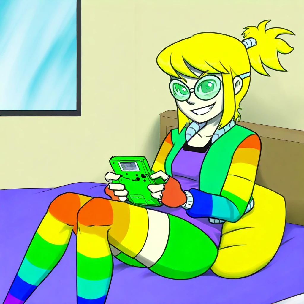glasses, tinted lenses, fingerless gloves, teal vest, rainbow stripes, green bike shorts, purple tank top, striped thighhighs, striped sleeves,