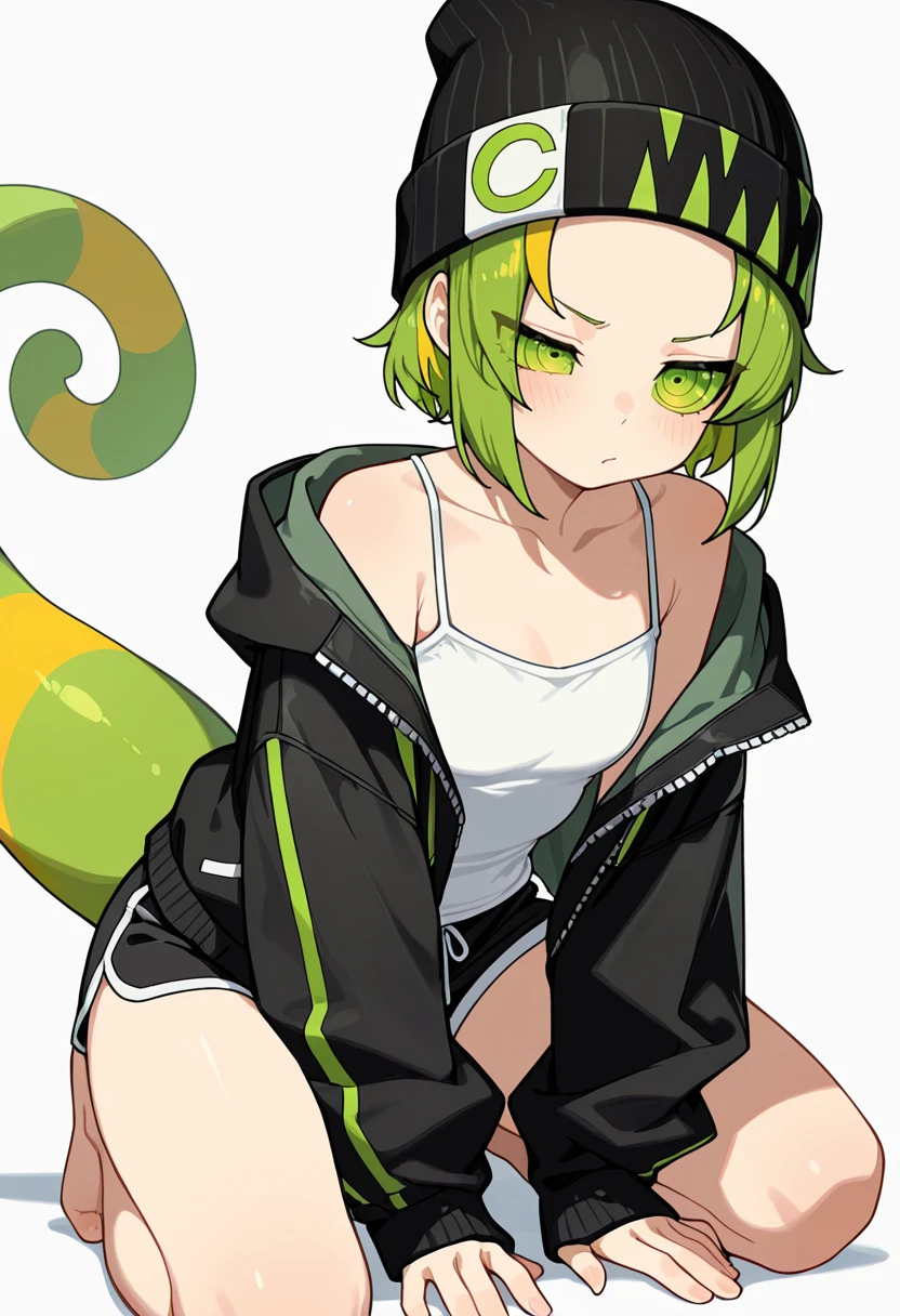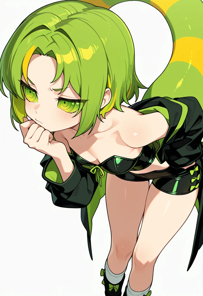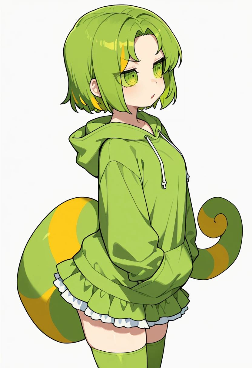 chameleon_cnr, 1girl, green hair, multicolored hair,ringed eyes,green eyes,green sclera, eyes visible through hair,lizard tail, 👗Default Outfit