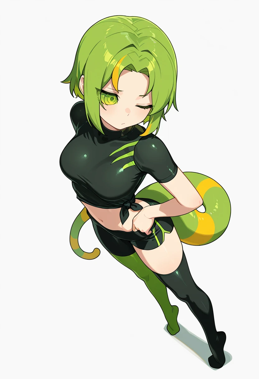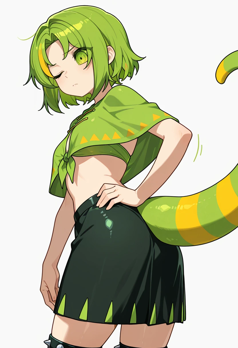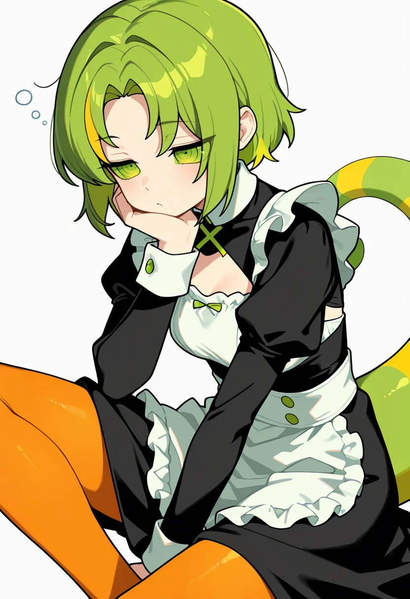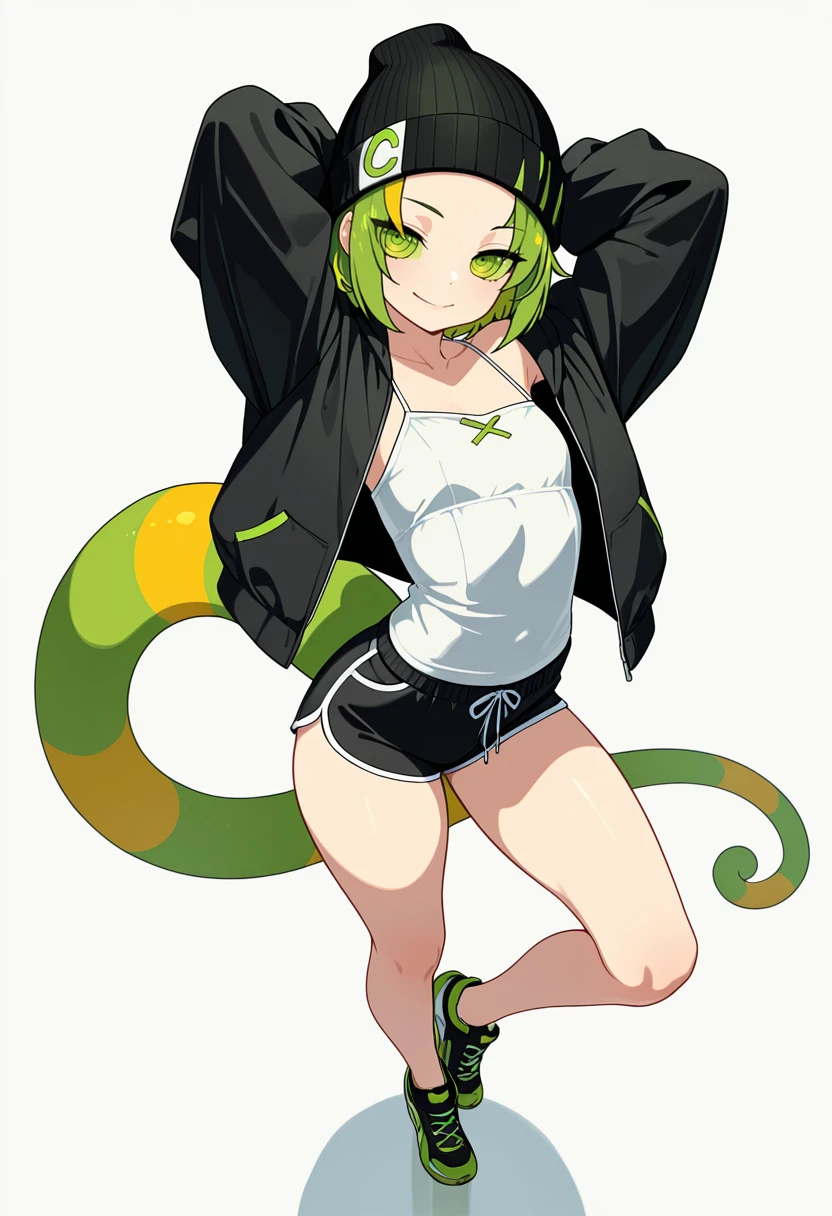 chameleon_cnr, 1girl, green hair, multicolored hair,ringed eyes,green eyes,green sclera, eyes visible through hair,lizard tail, 👗Default Outfit