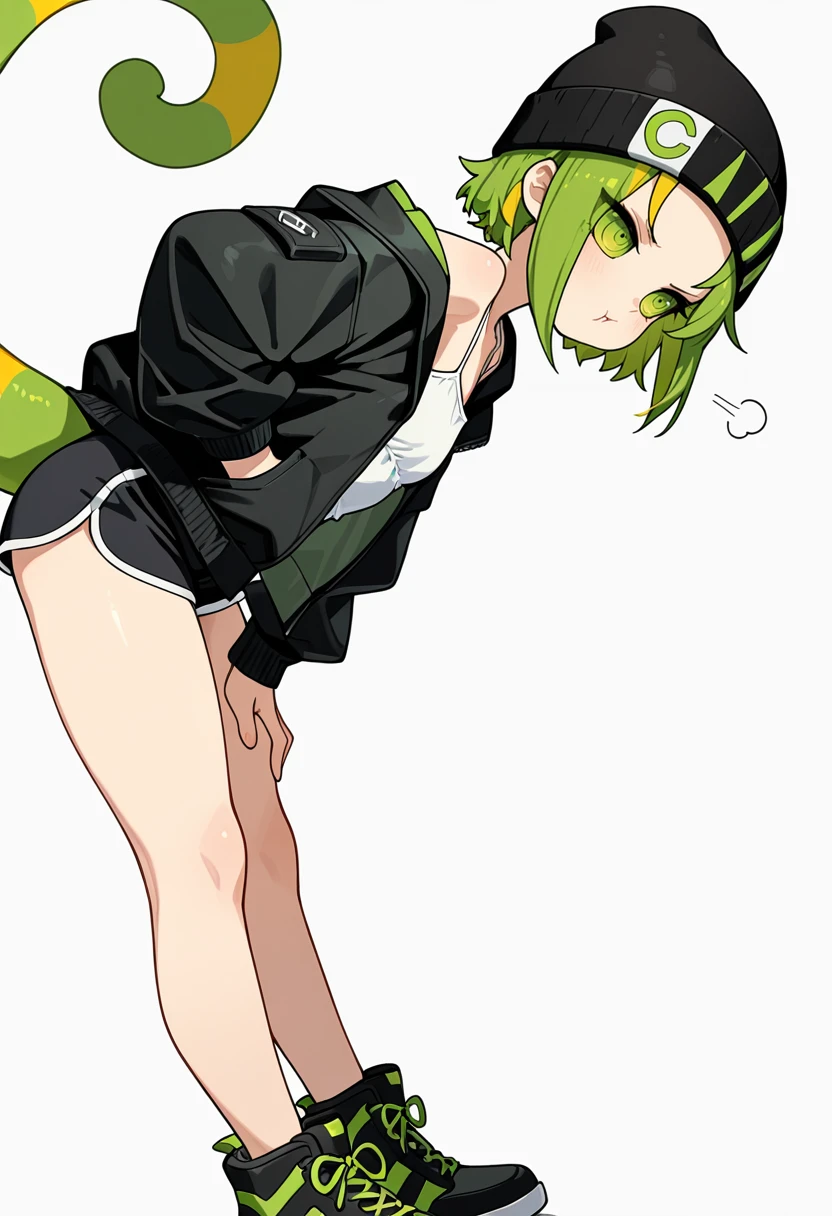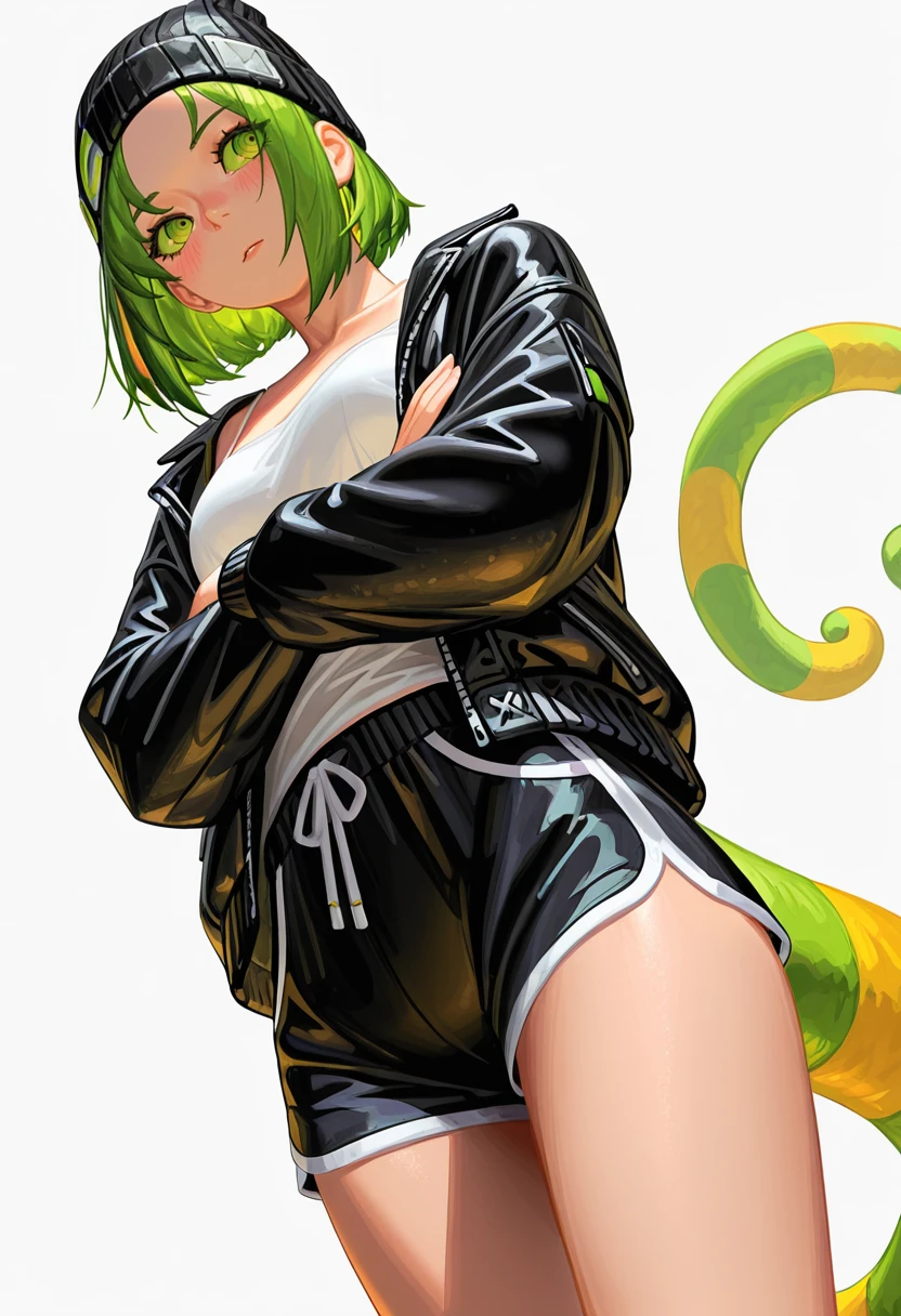 black beanie, black jacket, open jacket, white camisole,black dolphin shorts,Explanation and notes below👇