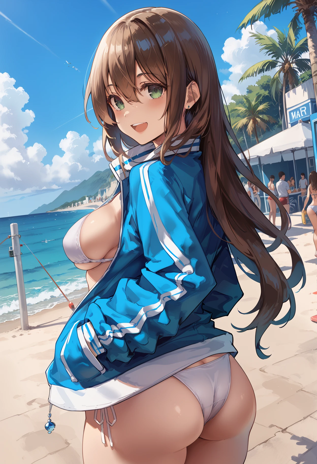 水着(vit-tagger-v2談)・jacket,long sleeves,open jacket,blue jacket,swimsuit,side-tie bikini bottom,open clothes,white bikini,string bikini,bikini