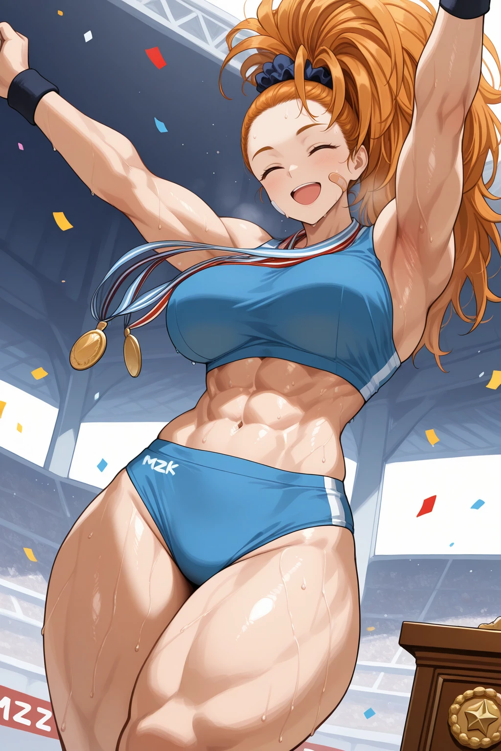 Appearance : mzk, tall female, muscular female, large breasts, blue eyes, orange hair, long hair, high ponytail, hair scrunchie, bandaid on cheek