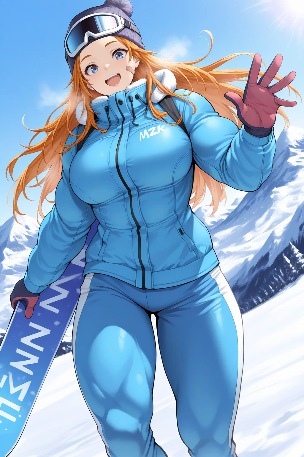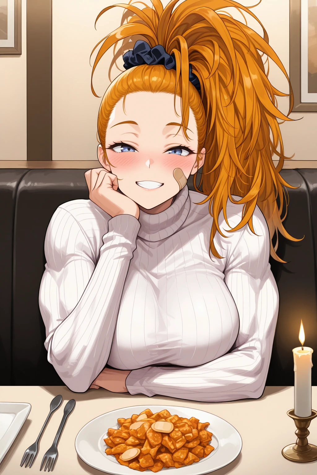 mzk, tall female, muscular female, large breasts, blue eyes, orange hair, long hair, high ponytail, hair scrunchie, bandaid on cheek