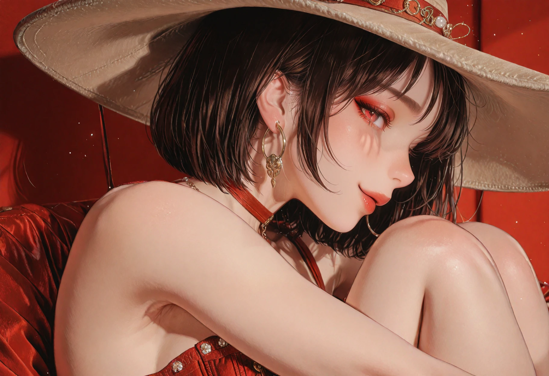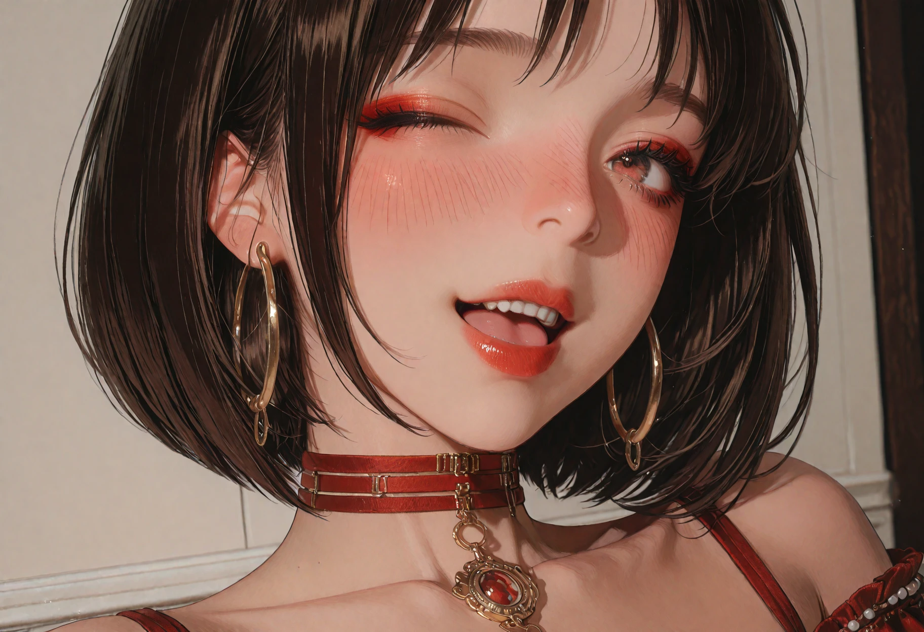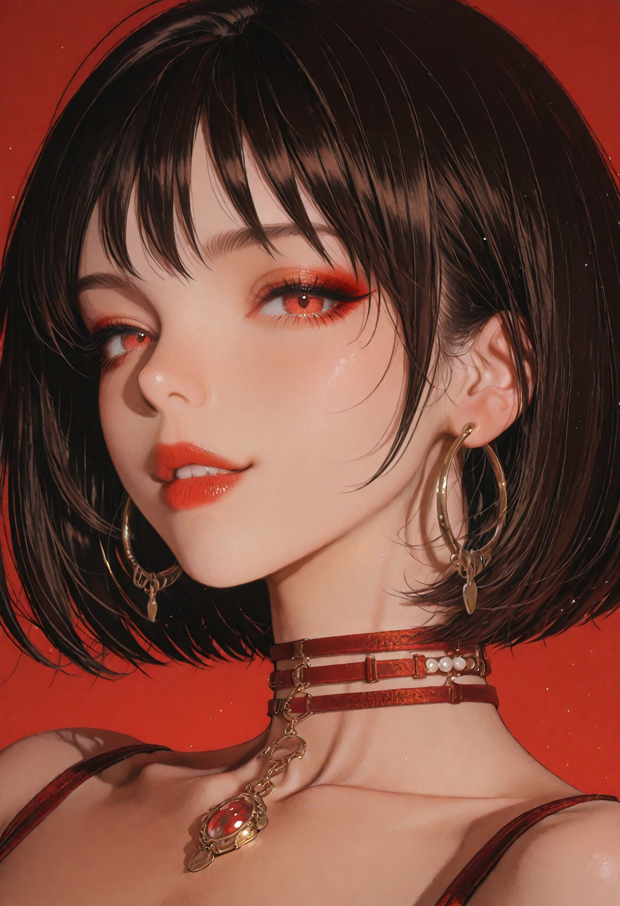 short bob, brown hair, brown eyes, makeup, red eyeshadow, glitter makeup, lipstickSignature Outfit: