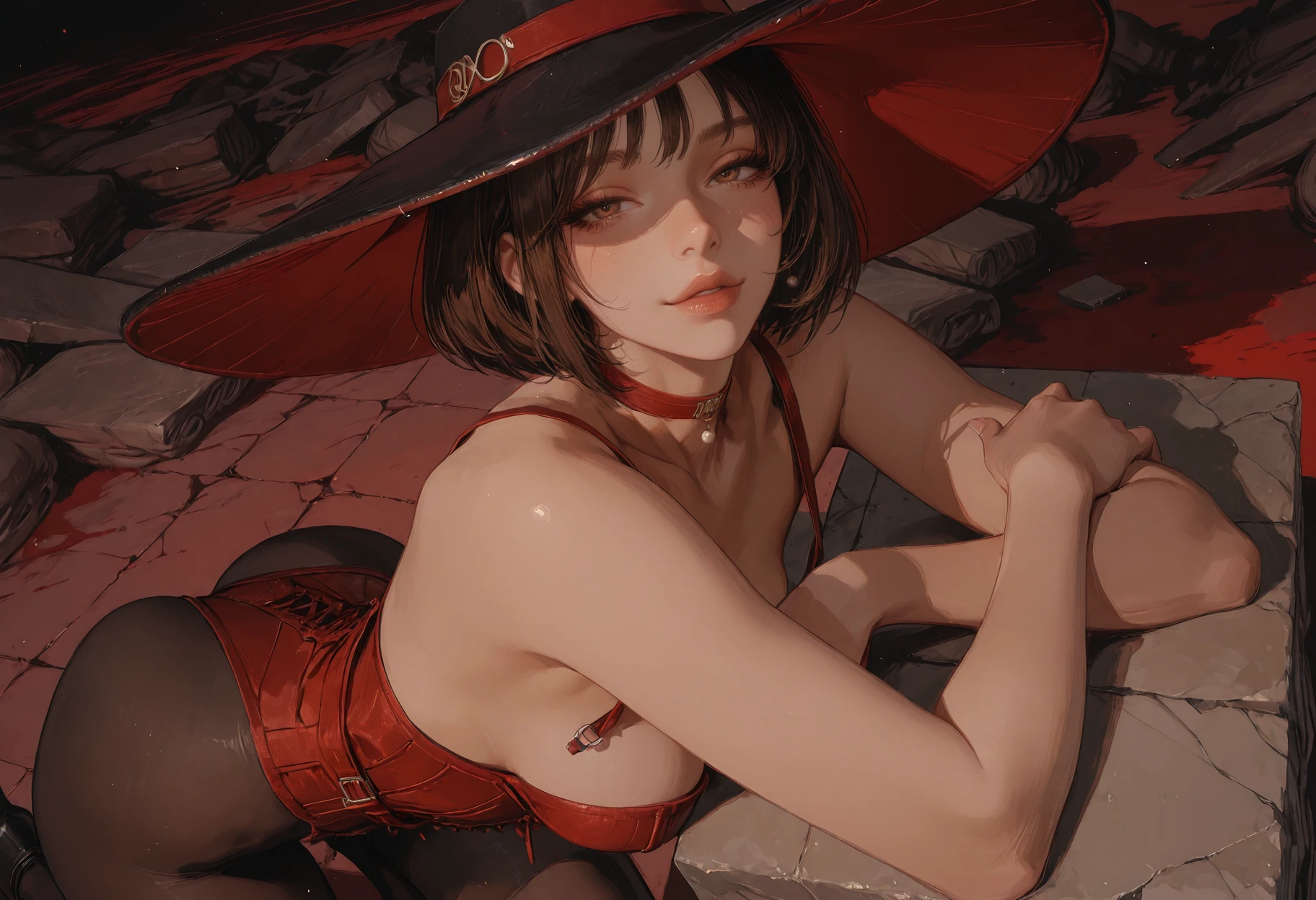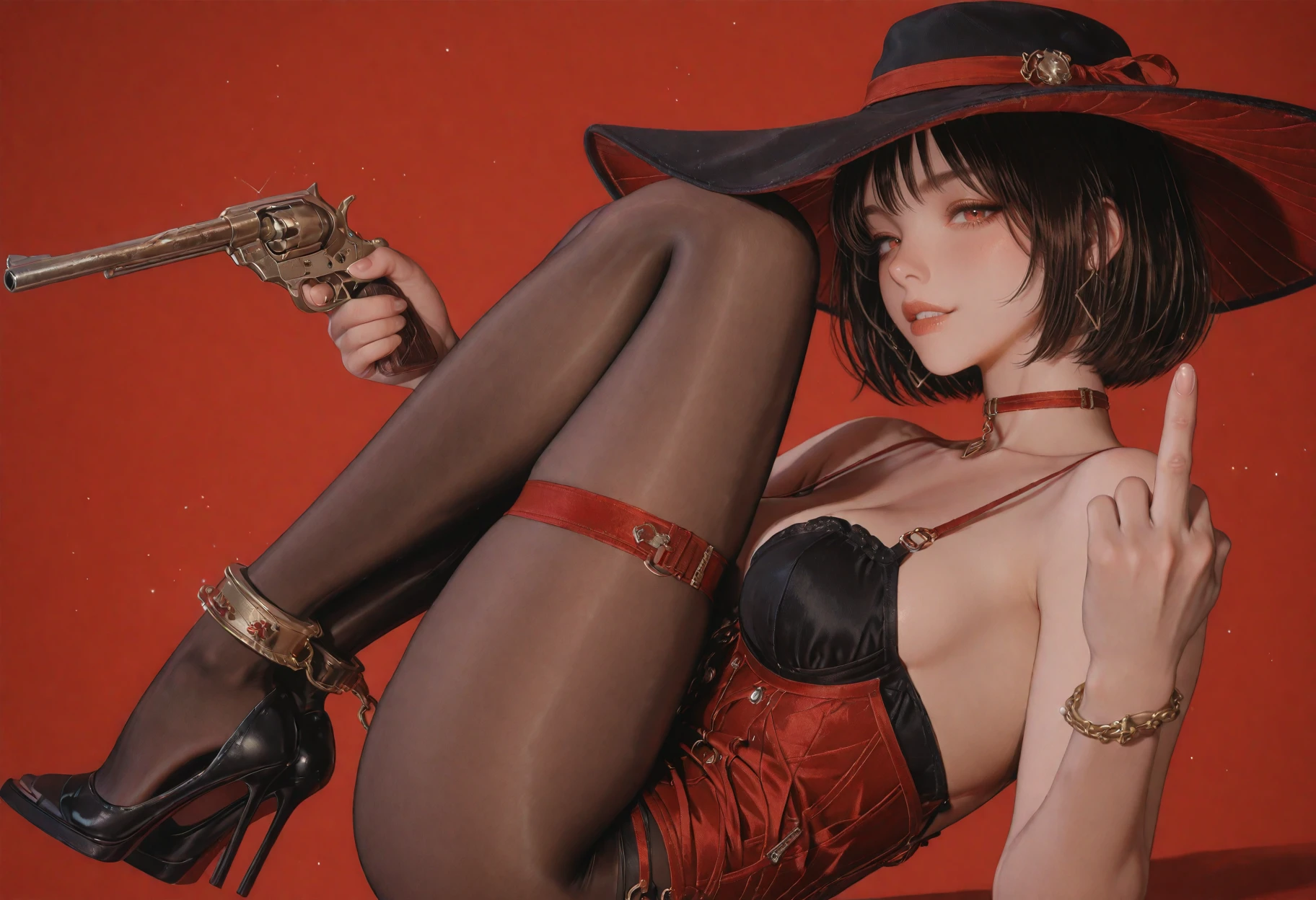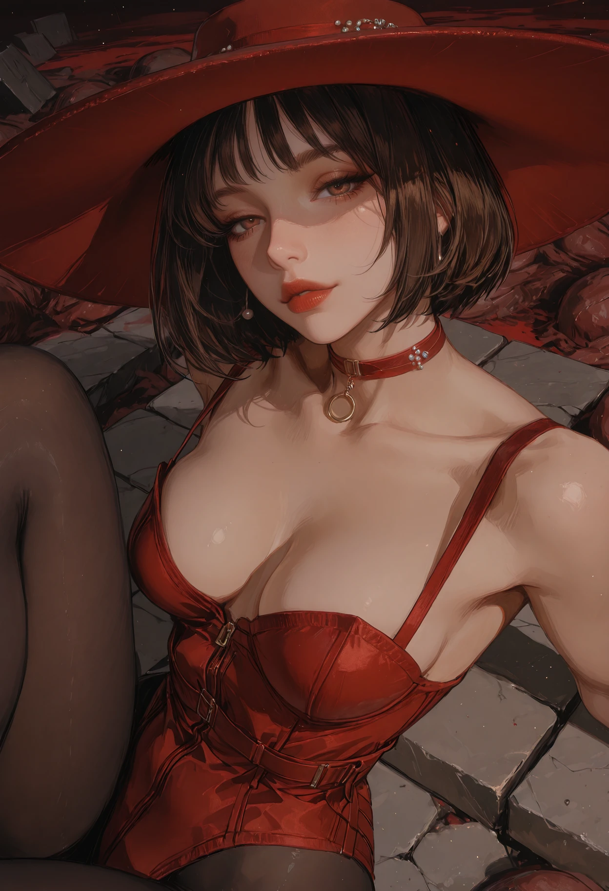 red corset, pearl buttons, red choker, gold pendant, wide-brim hat, black pantyhoseSignature Gear:
