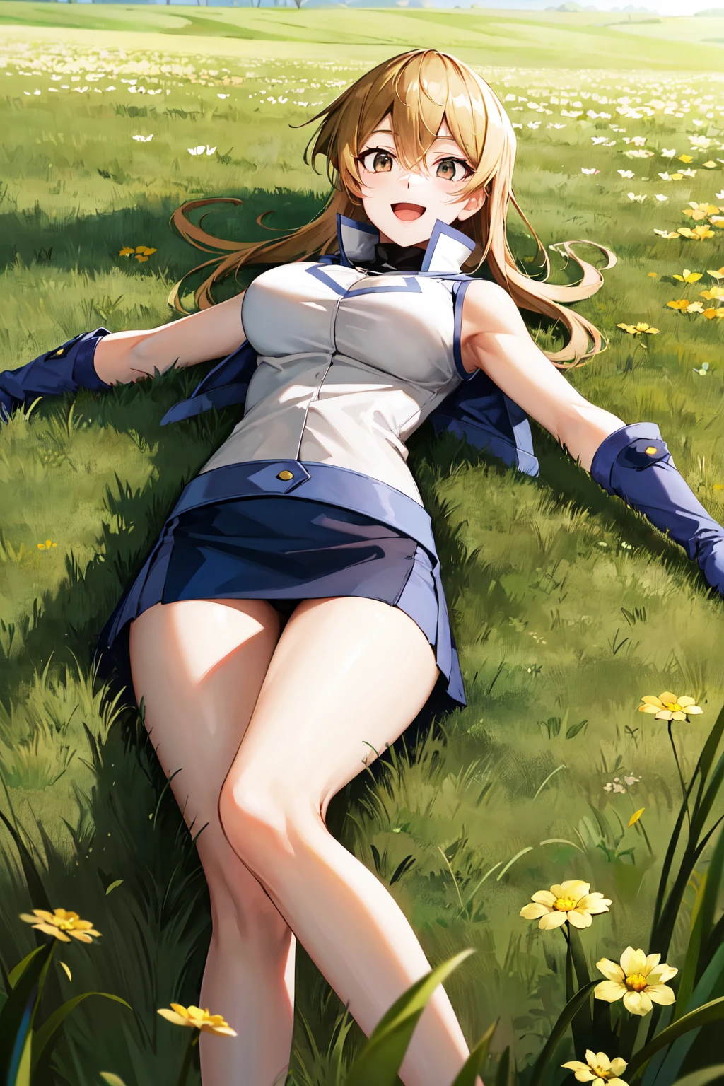 ta1, white jacket, sleeveless, blue skirt, fingerless gloves, large breasts