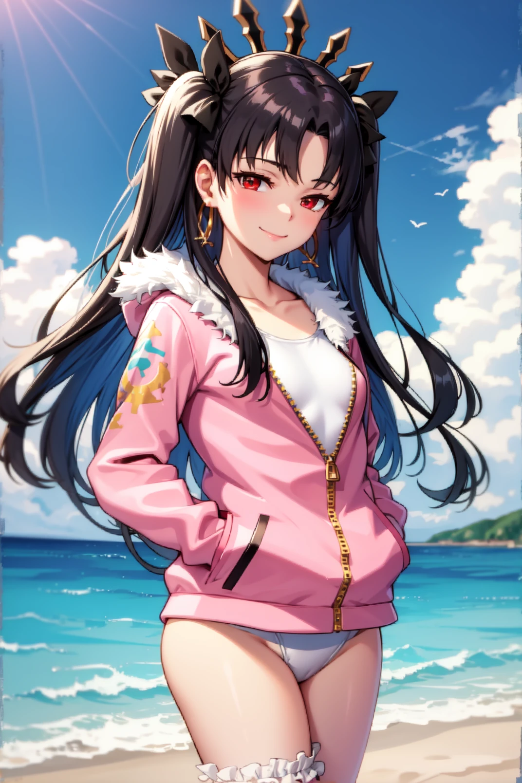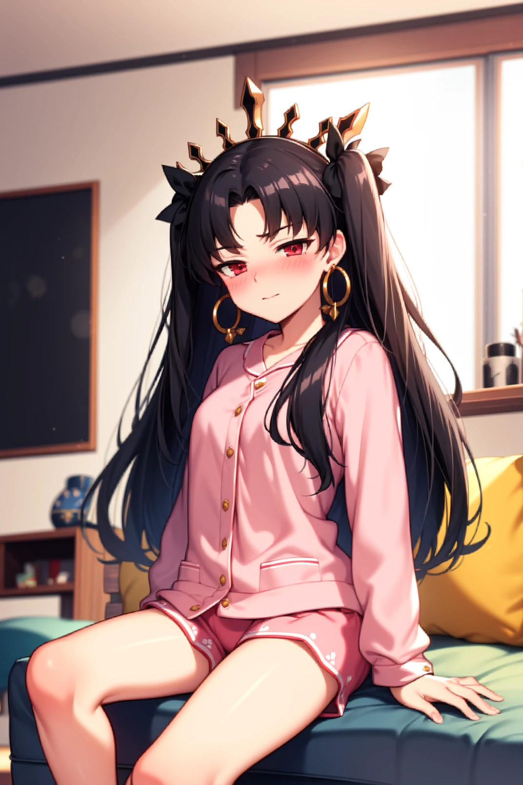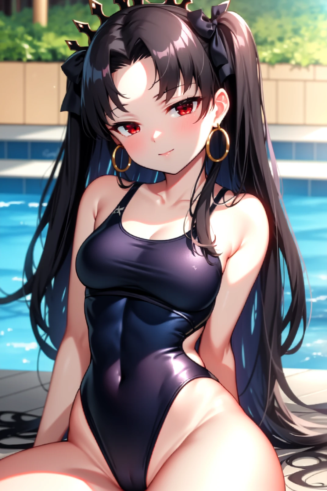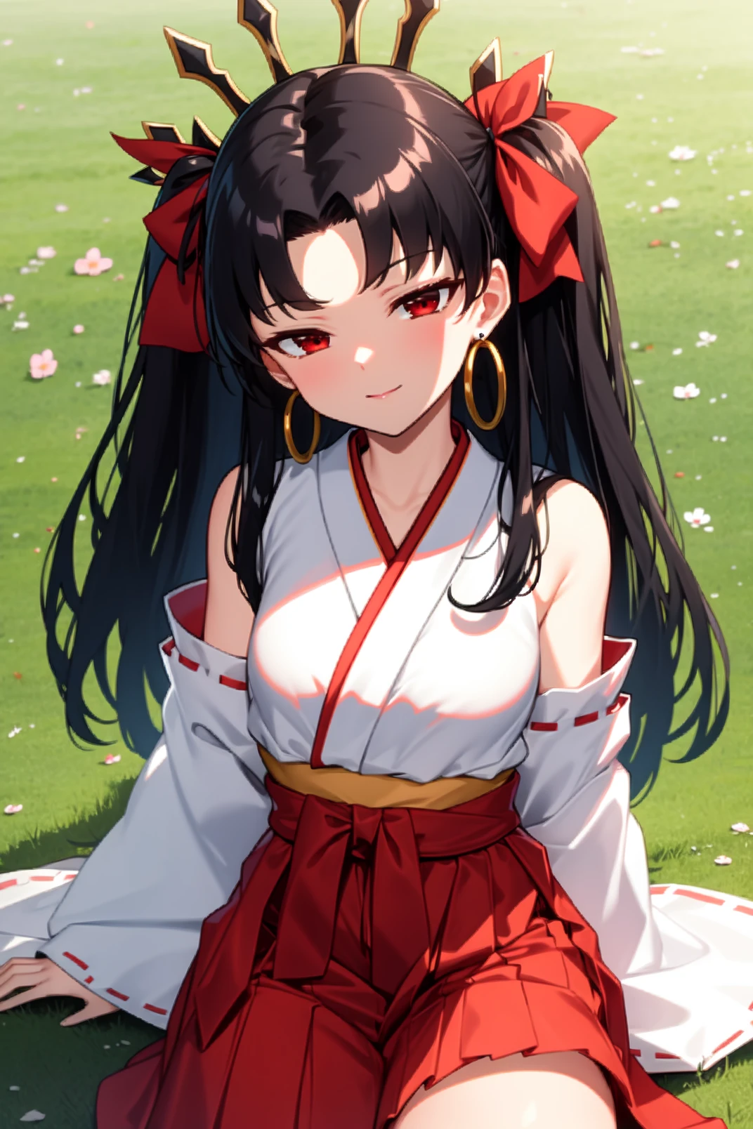 ishtar, red eyes, black hair, long hair, two side up, parted bangs, black hair ribbon, tiara, hoop earrings, jewelry, neck ring