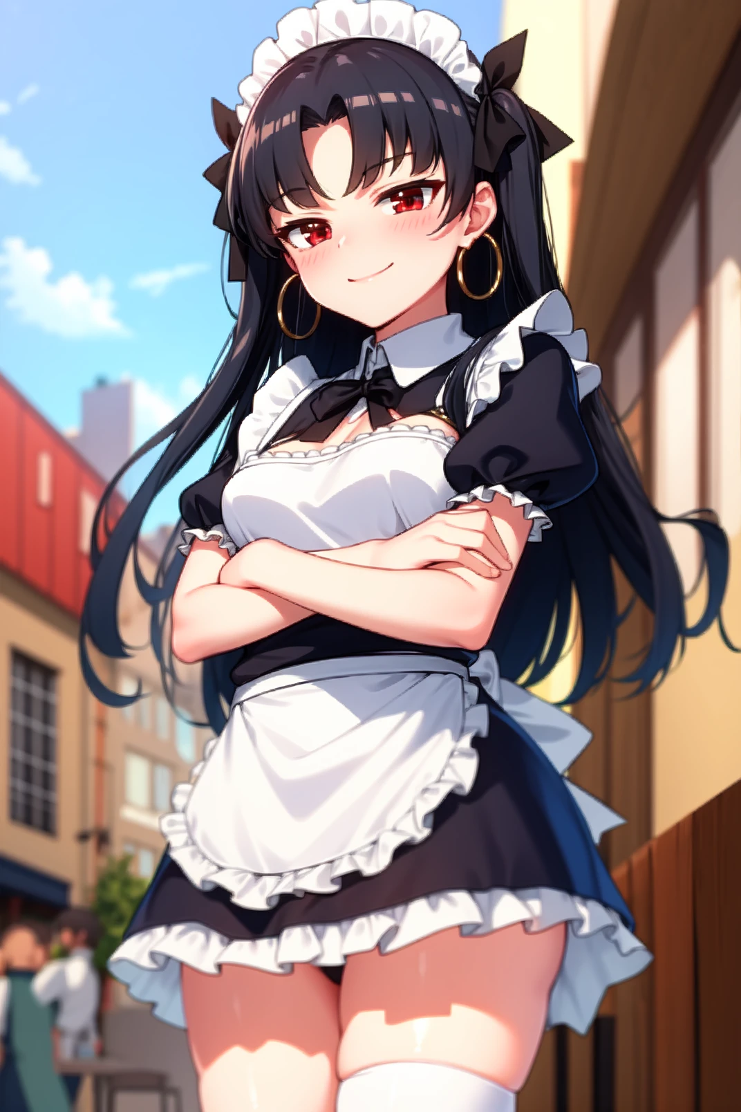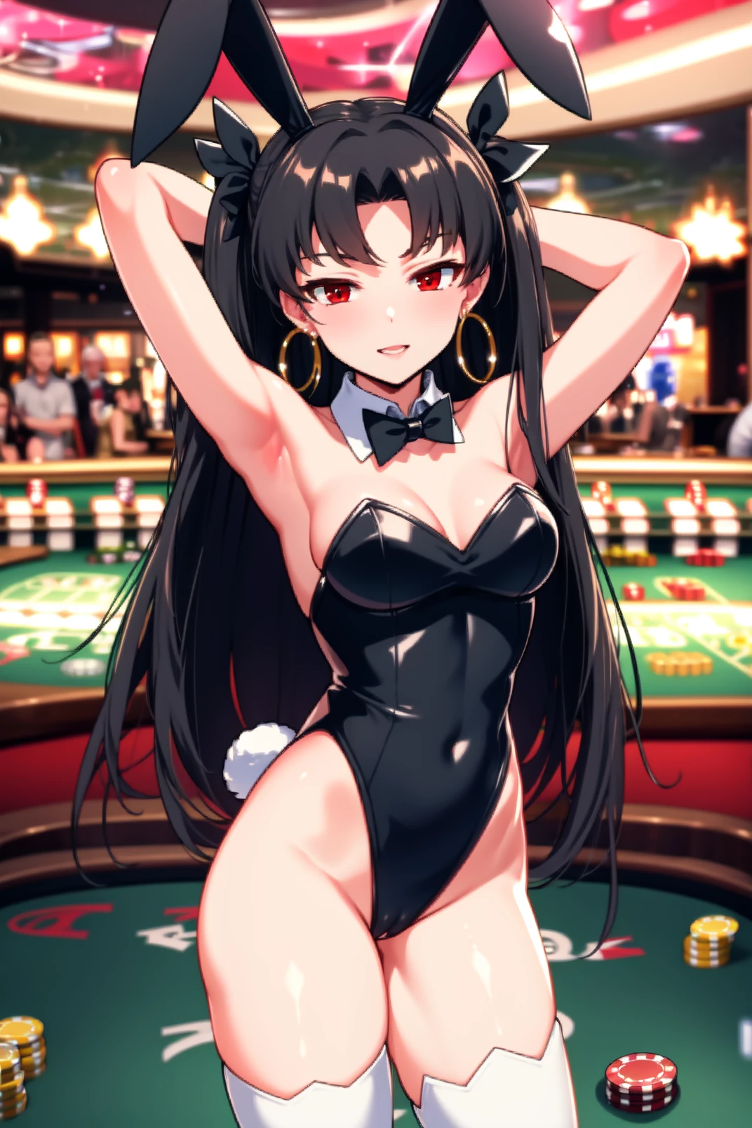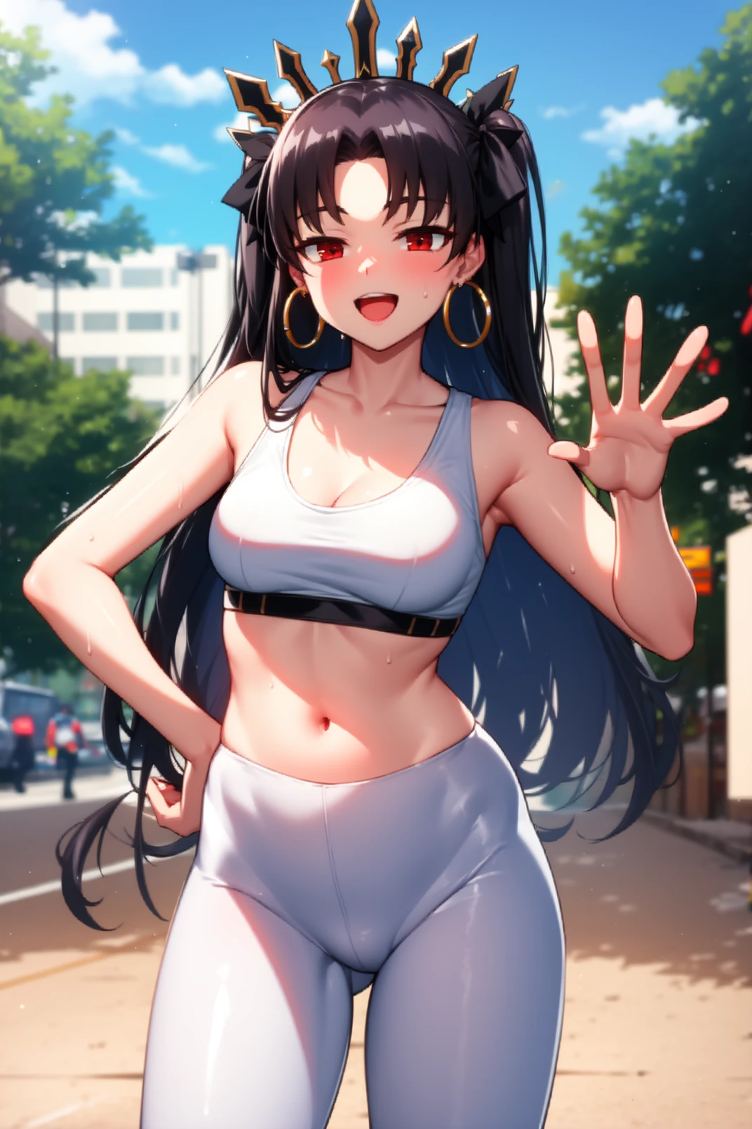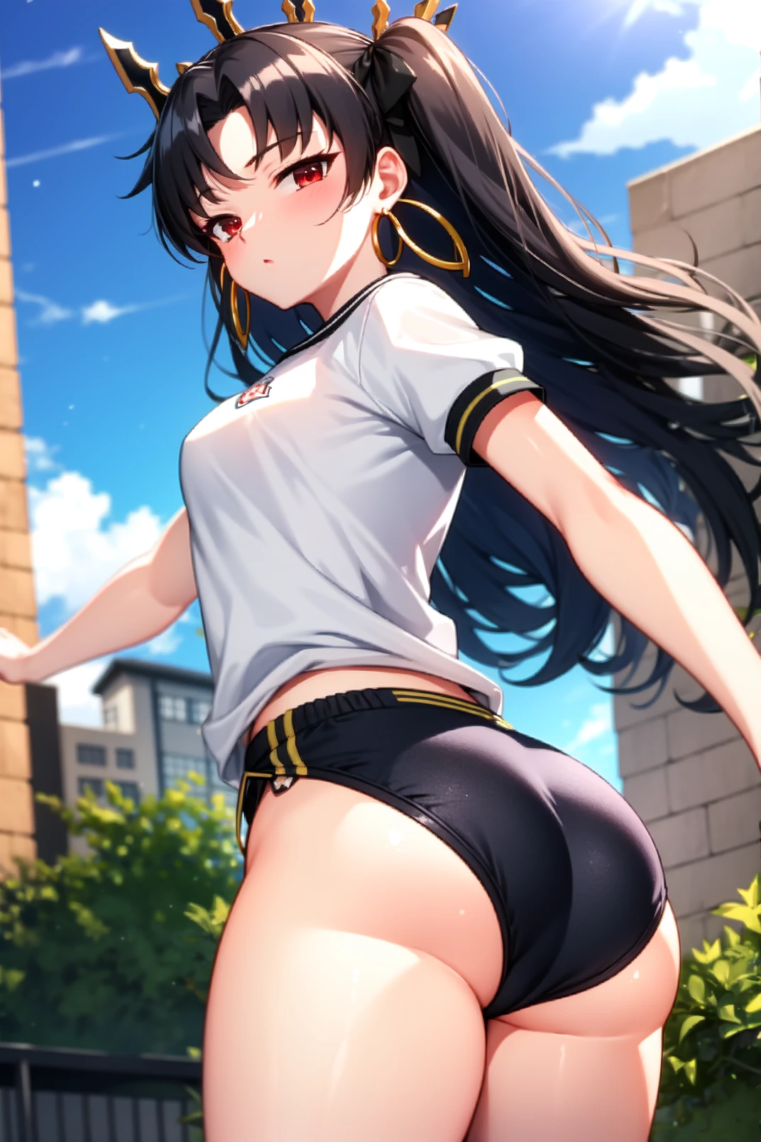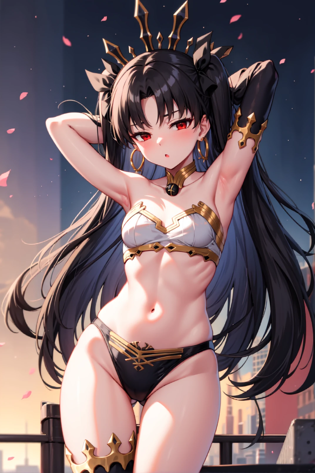 appearance: ishtar, red eyes, black hair, long hair, two side up, parted bangs, black hair ribbon, tiara, hoop earrings, jewelry, neck ring