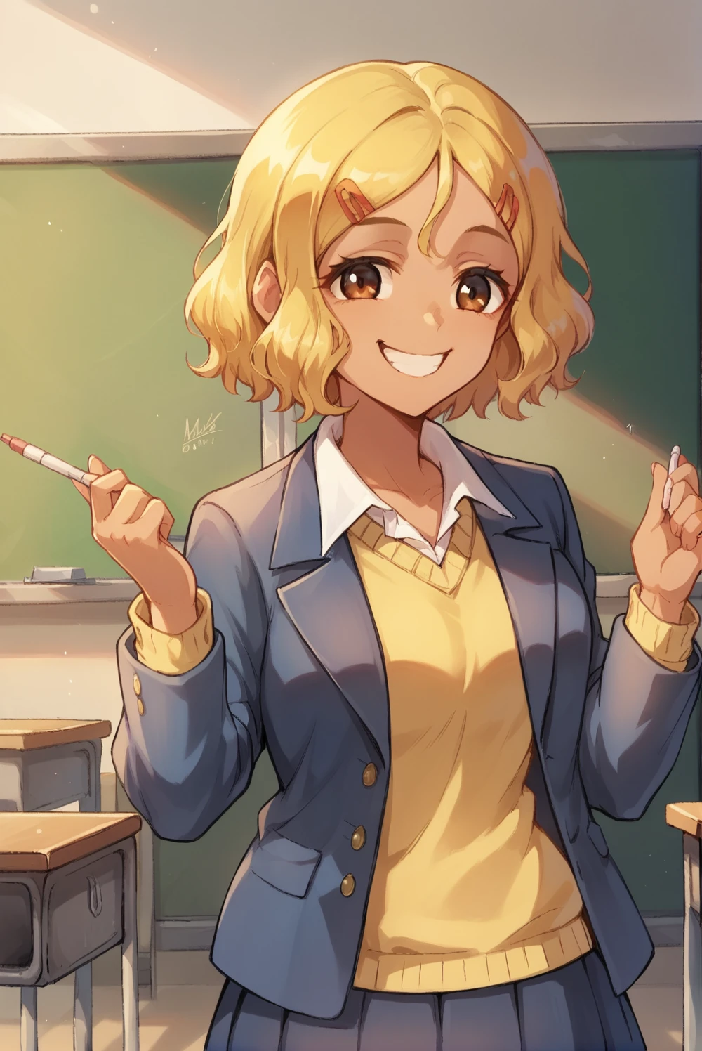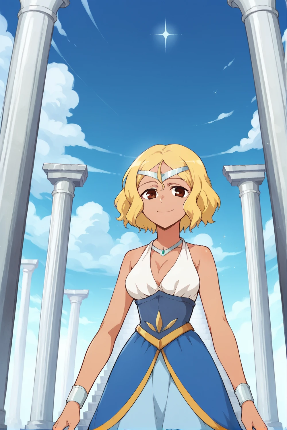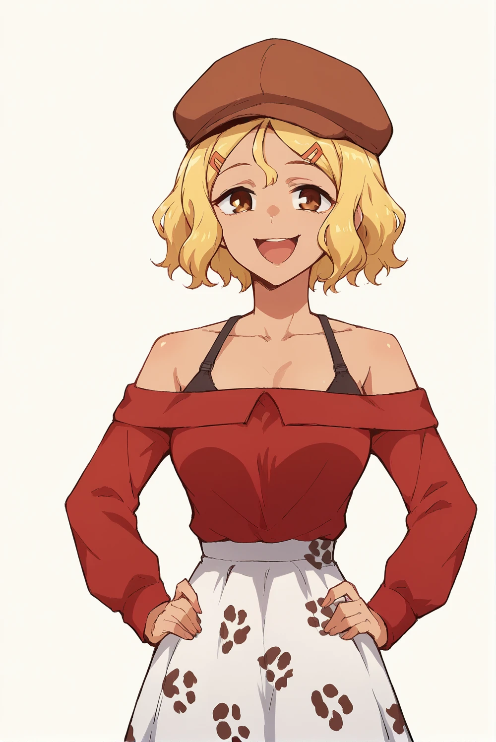 White shirt, blue skirt