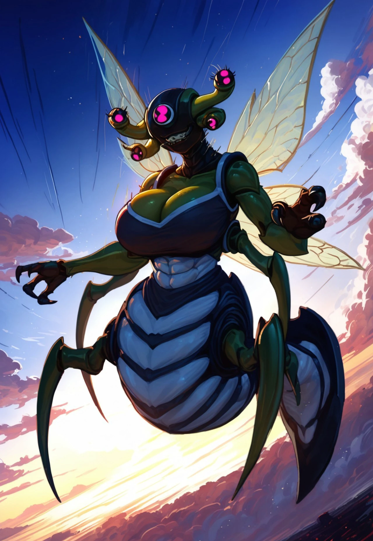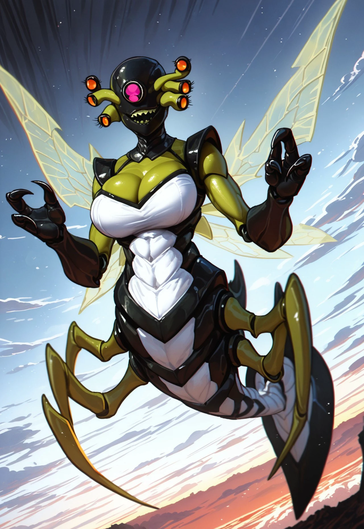 arthropod abdomen, six-pack abs, noseless, big breasts, alien girl, extra eyes, no pupils, 4eyes, four antennae, green skin, two-toned skin, dark face, black and white clothes, crooked teeth, arthropod girl, black hands, claws, fewer digits, 3 fingers, insect green wings, wings, stinger on tail, tail, insect legs, 4 legs