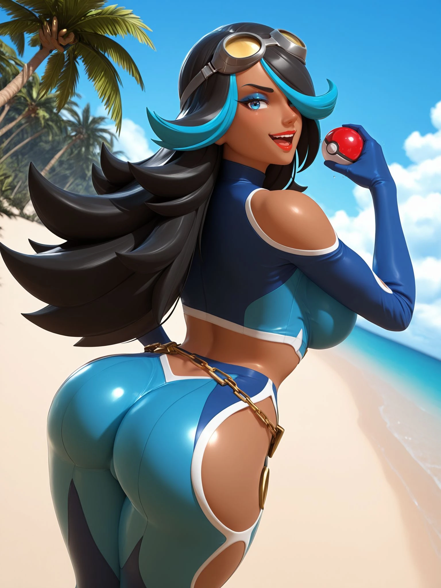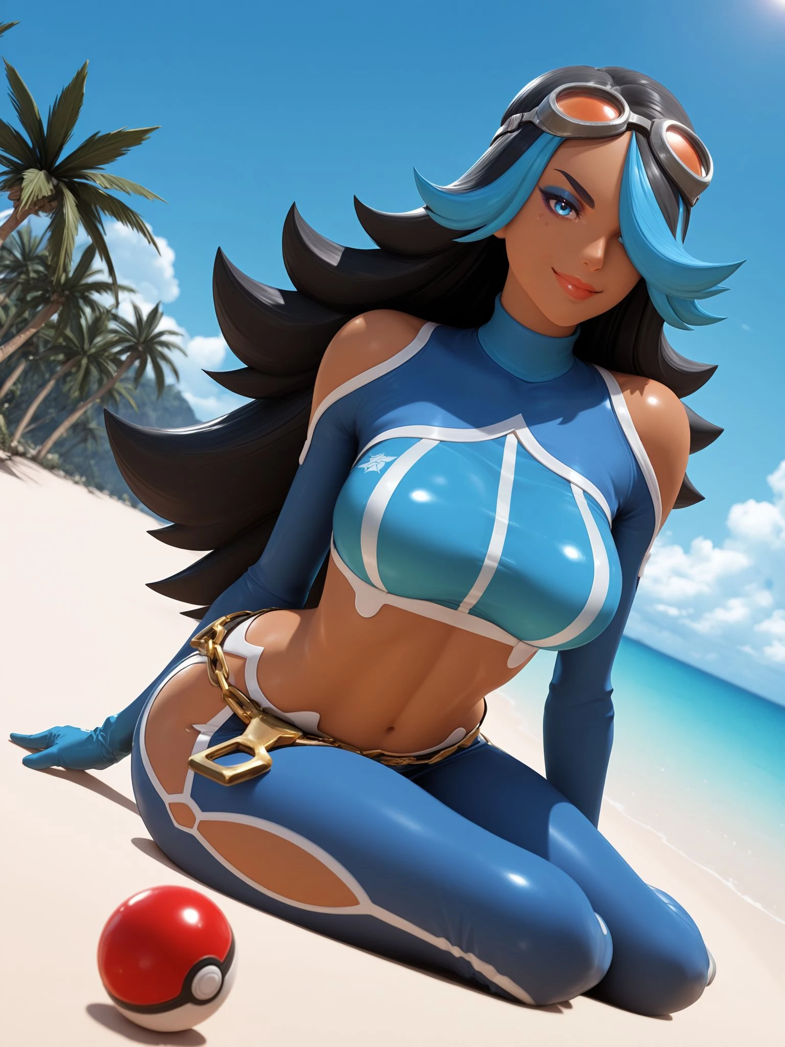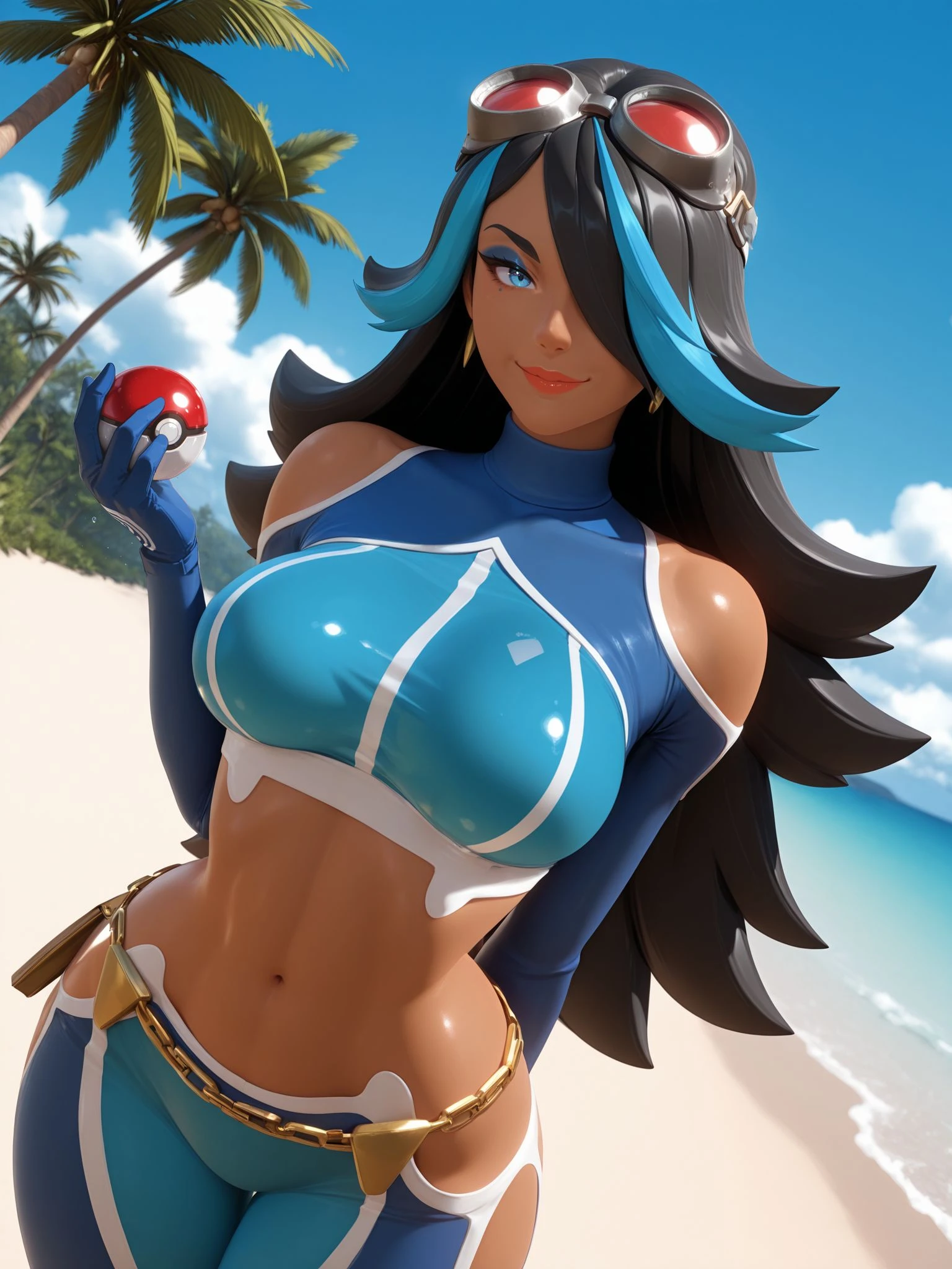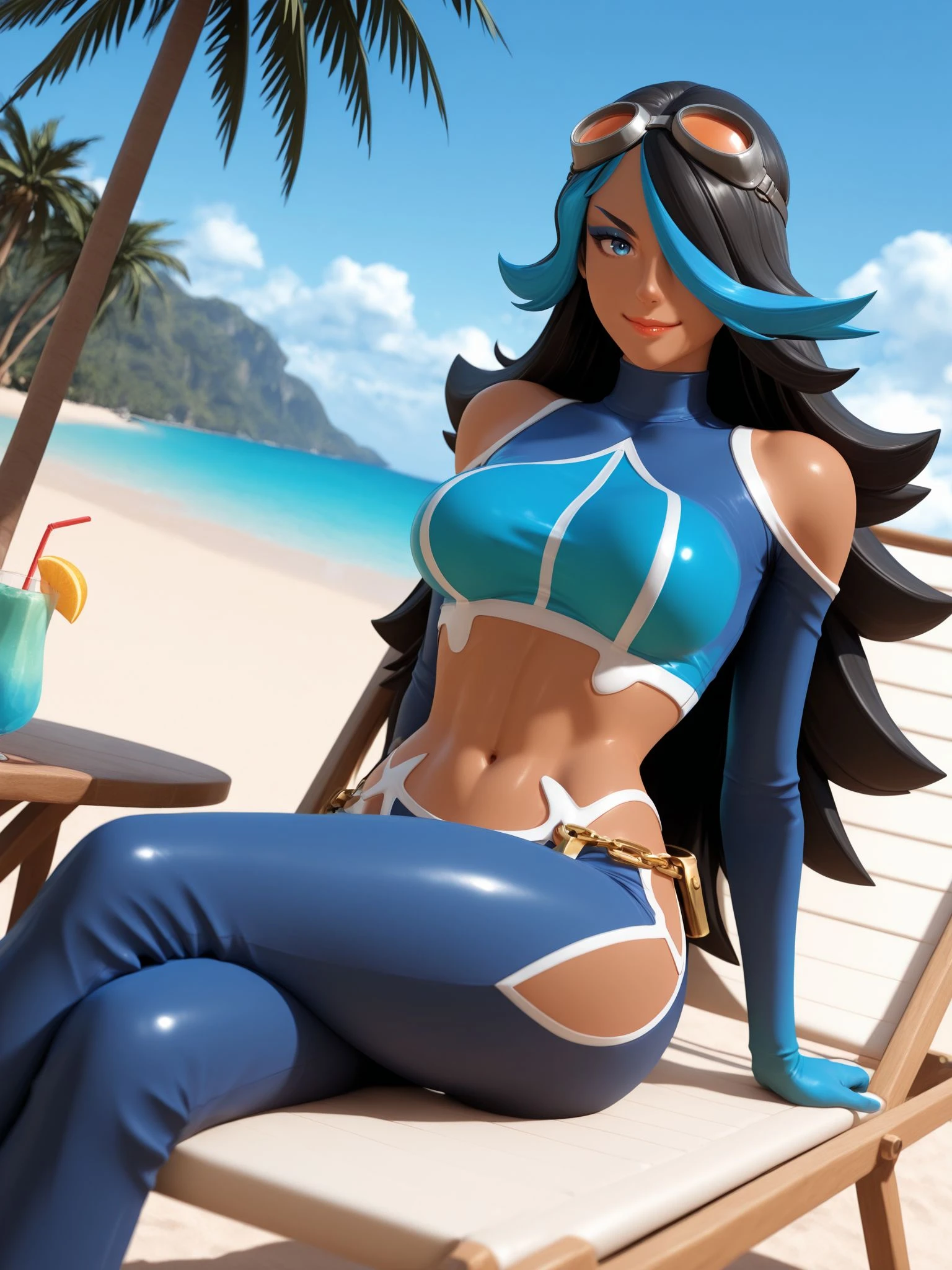 team aqua, goggles, goggles on head, blue crop top, long sleeves, turtleneck, shoulder cutout, blue gloves, navel, midriff, blue pants, hip vent, chain belt,