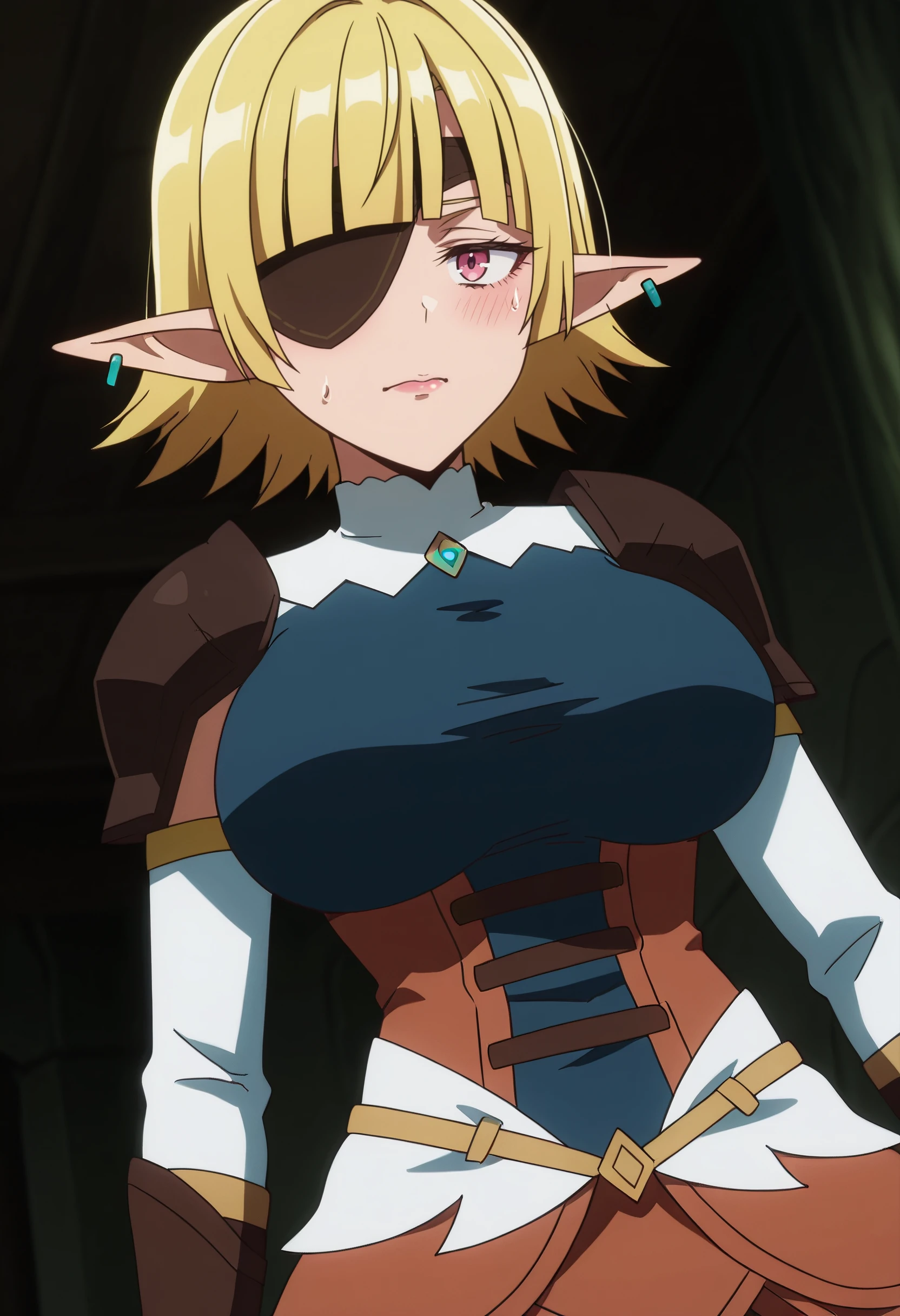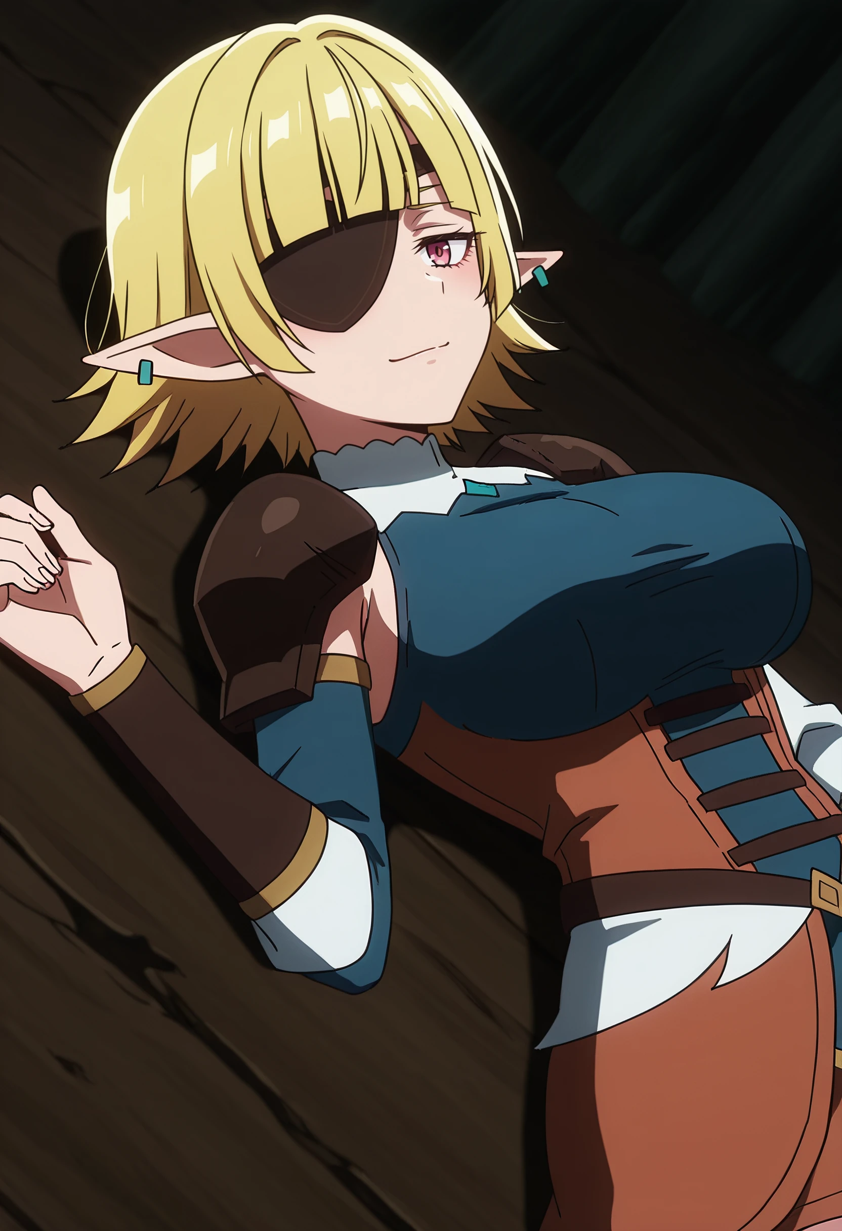 eyepatch, one eye covered, earrings, dress, blue shirt, long sleeves, brown dress,