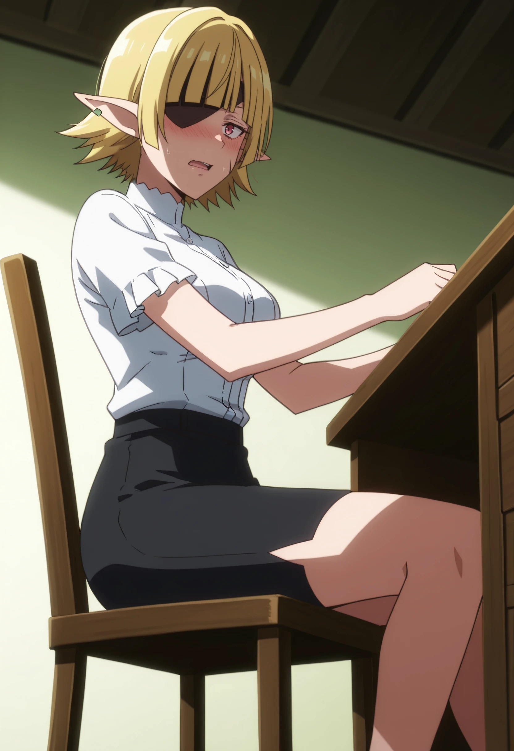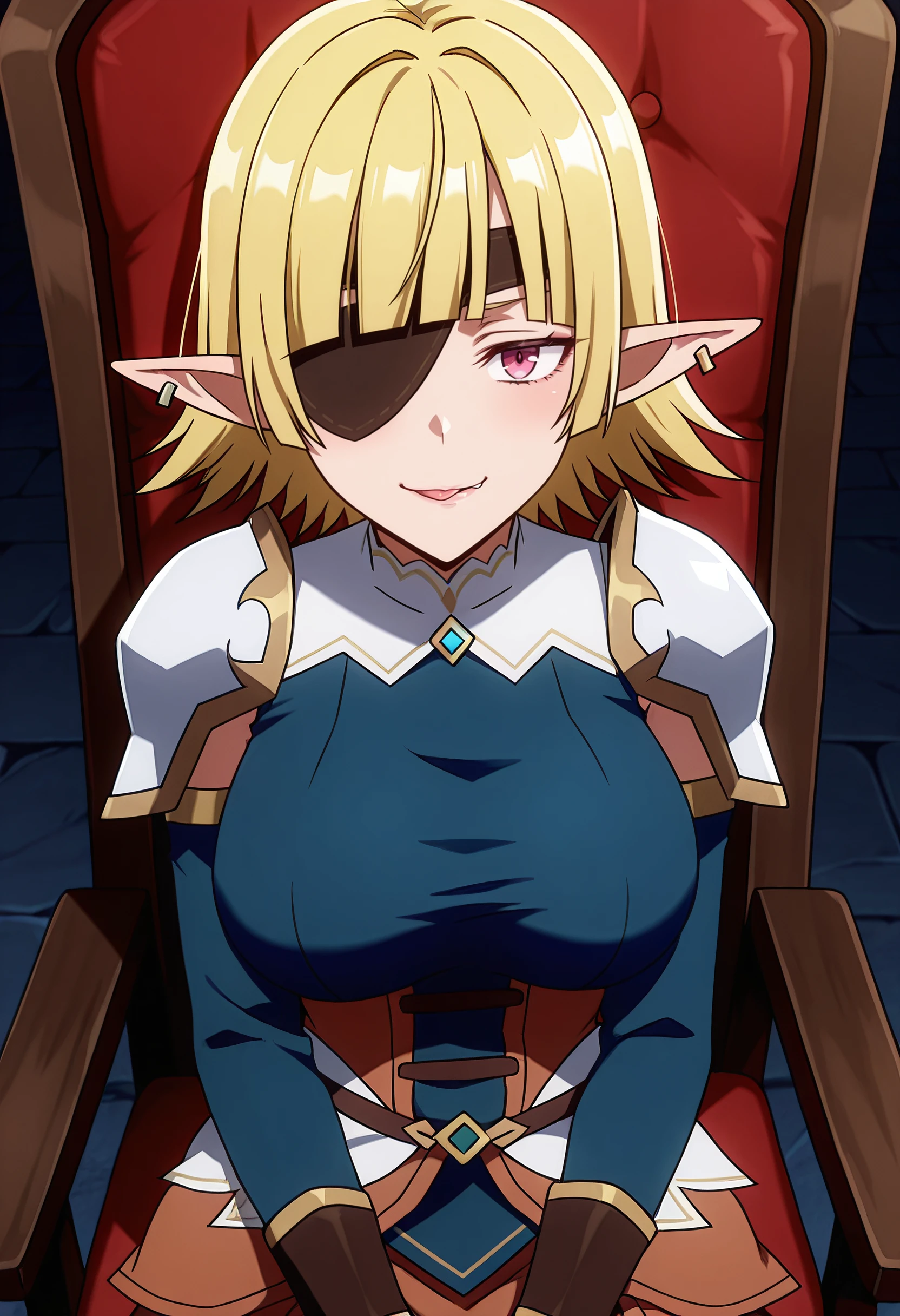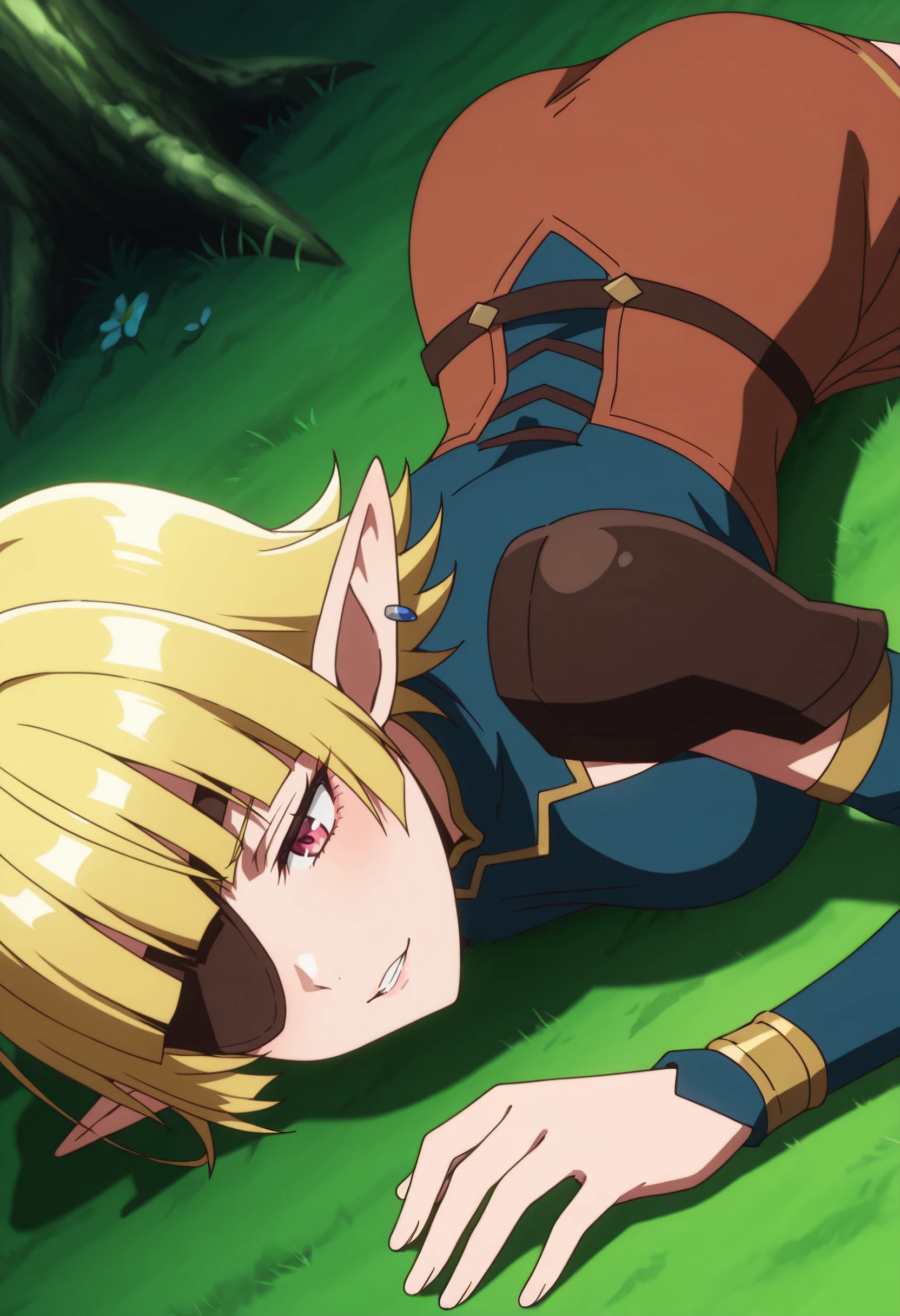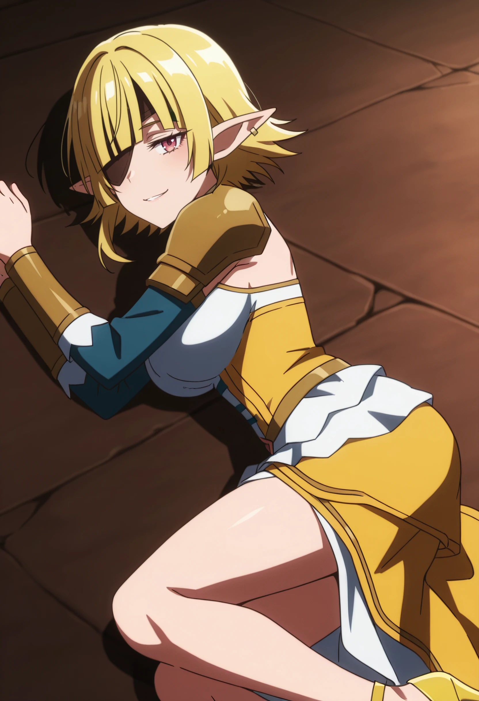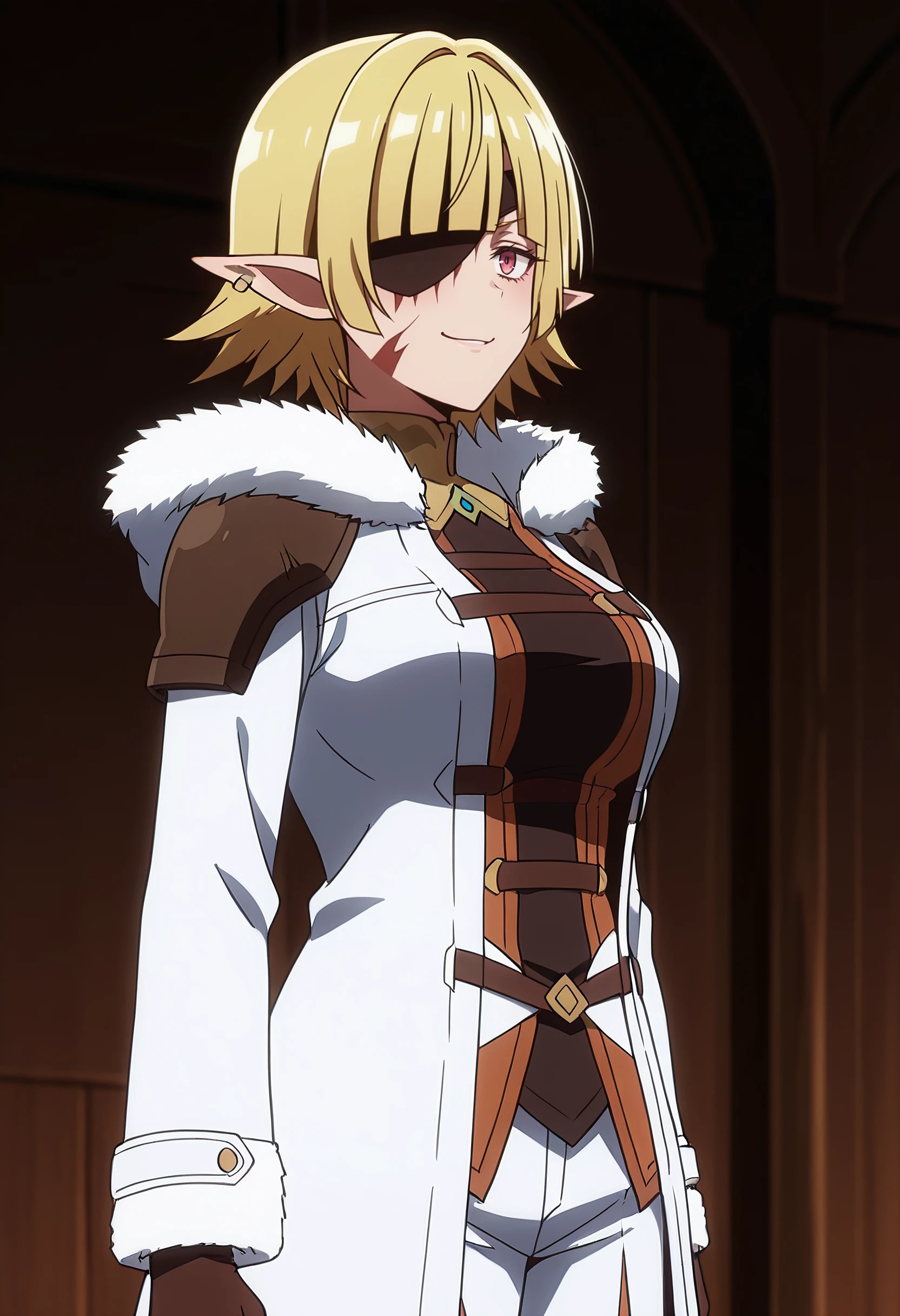 BGusiona, elf, pointy ears, short hair, hair over one eye, blunt bangs, blonde hair,