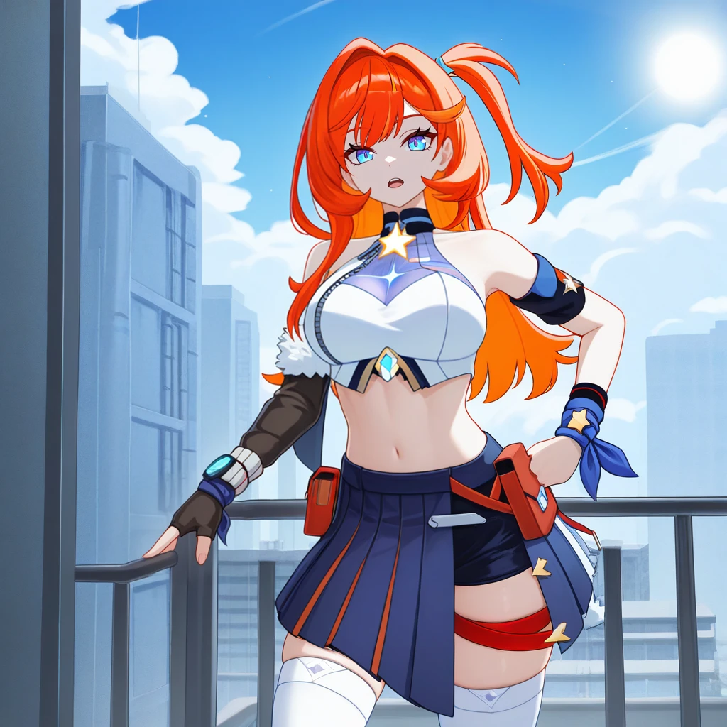 Senadina, Fol001, Sen_Def, blue eyes, red hair, orange hair, streaked hair, halter shirt, see-through clothes, halterneck, white crop top, zipper top, see-through cleavage, covered breasts, chest scar, midriff, one side up, star (symbol), short front long back skirt, waist pouch, pleated skirt, dark blue skirt, side slit, short shorts, shorts under skirt, bare shoulders, armbands, star pendant, dark brown single fingerless glove, single elbow glove, single detached sleeve, single sleeve, short sleeves, wrist watch, blue wrist ribbon, fur trim, fur-trimmed sleeves, wristband, red thigh strap, white thighhighs,Senadina Goddess Outfit: