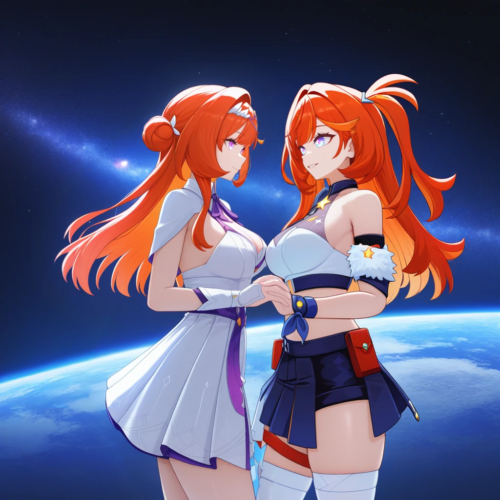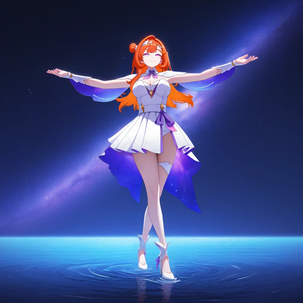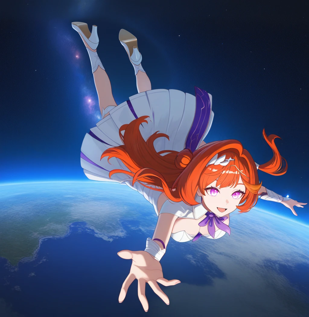 Sena_Goddess, long hair, red hair, purple eyes, dress, hair ornament, cleavage, jewelry, purple neck ribbon, earrings, white dress,The results of your generations are dependent on the additional LoRAs, weights, and models you use, so it may not work or come out as consistent as my sample images.