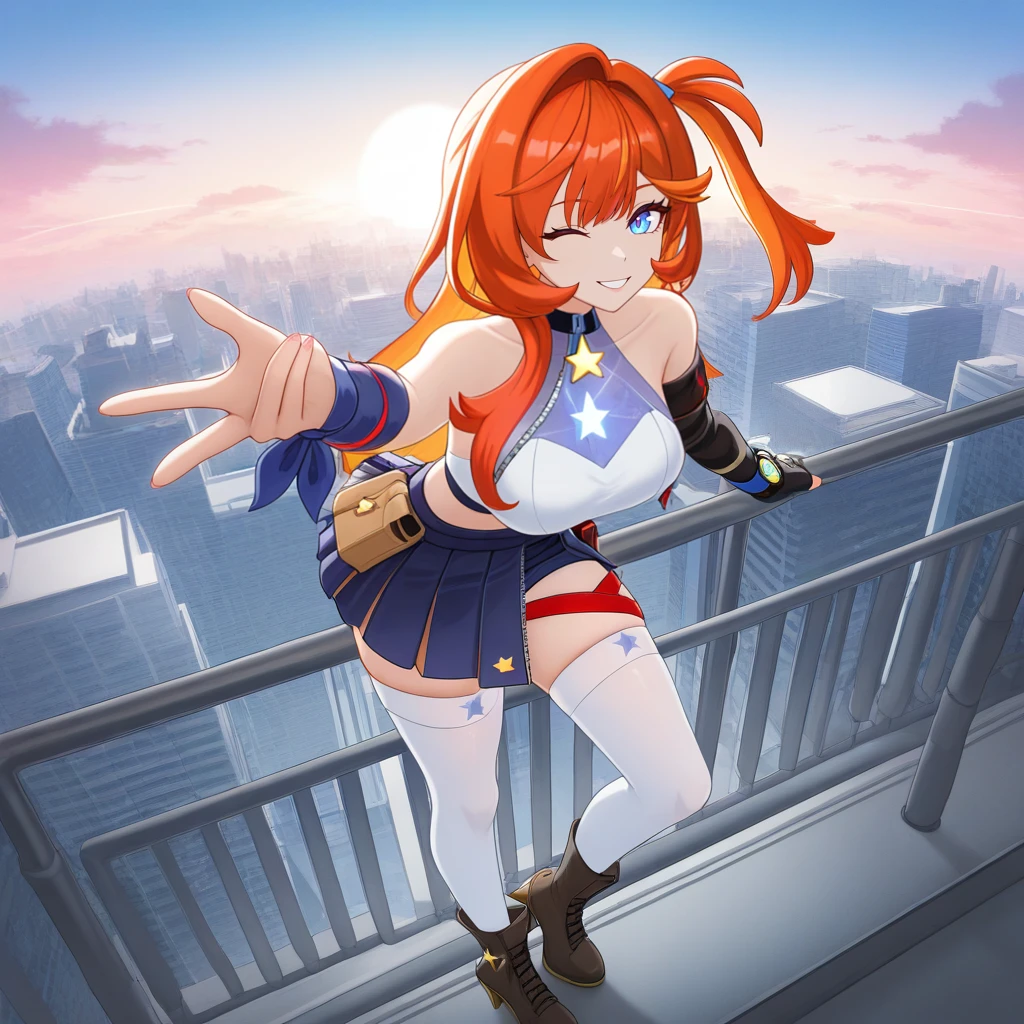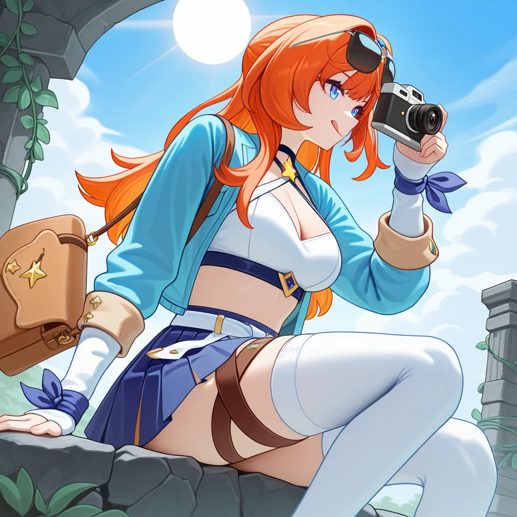Senadina, Fol002, Sen_Stg, blue eyes, red hair, orange hair, halter top, cropped shirt, midriff, criss-cross halter, white shirt, alt star pendant, cleavage cutout, eyewear on head, sunglasses, open jacket, light blue jacket, shoulder bag, alt pleated skirt, blue skirt, white belt ribbon, white thighhighs, one side up, white arm warmers, light blue sleeves, long sleeves, brown thigh strap, cleavage, chest scar, underbust, blue wrist ribbon,Chinese Stigmata Outfit: