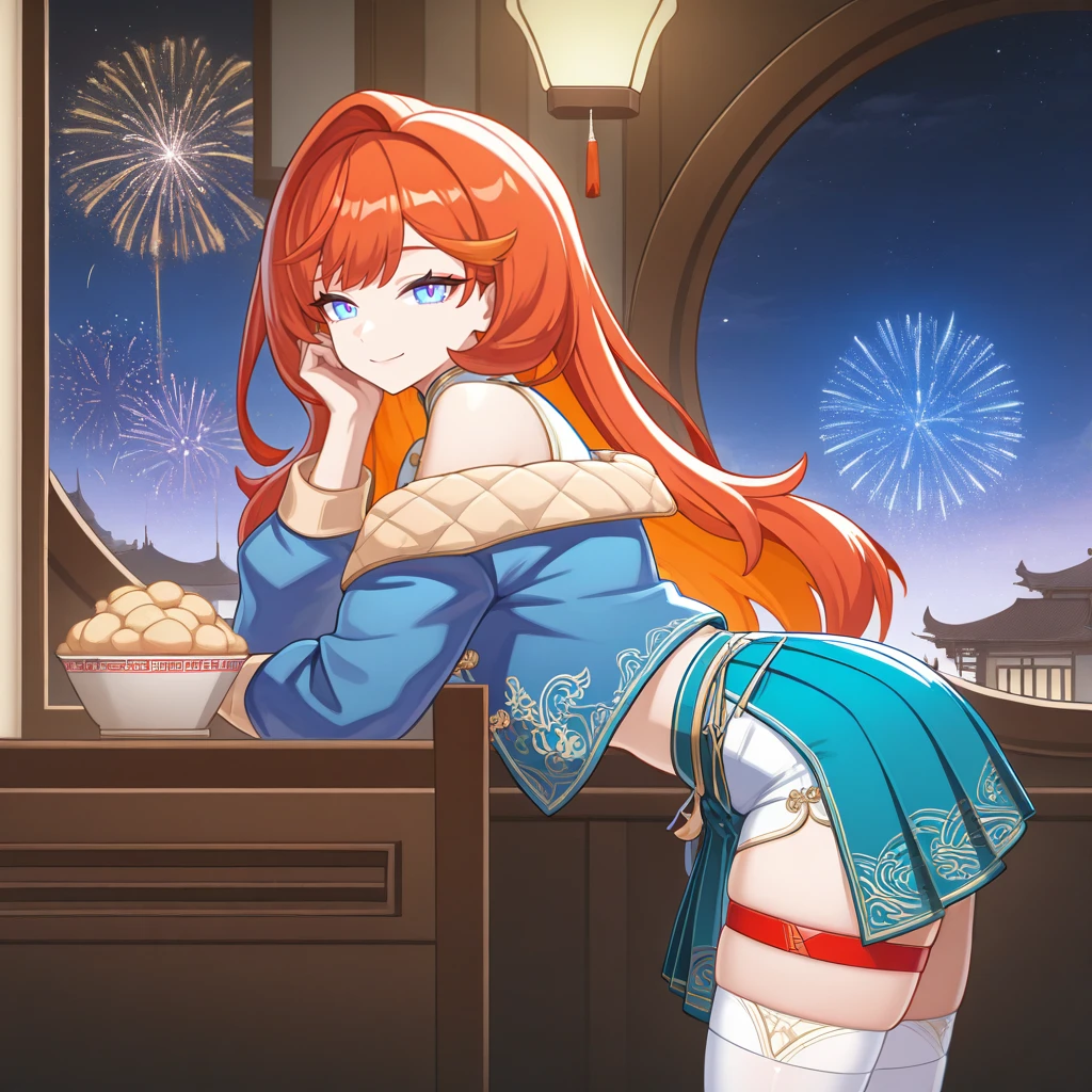 Senadina, Fol003, Sen_CN, blue eyes, white sleeveless turtleneck crop top, chinese clothes, sleeveless, bare shoulders, off-shoulder jacket, blue jacket, midriff, alternate pleated skirt, teal skirt, alternate side slit, red thigh strap, white thighhighs, gold trim, white shorts, short under skirt, orange hair, red hair,Anniversary Outfit:
