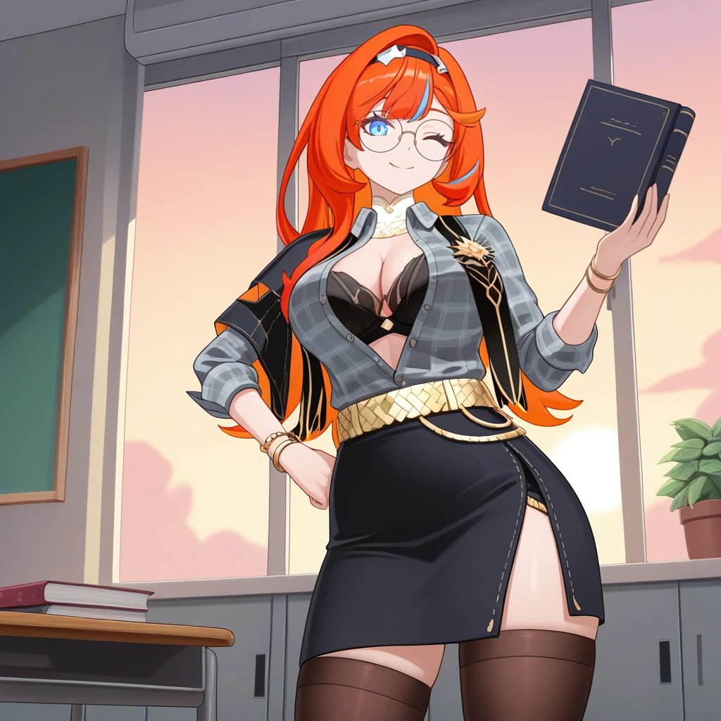 Senadina, Fol002, Sen_Tch, blue eyes, red hair, orange hair, streaked hair, light blue hair, round eyewear, glasses, cleavage, pencil skirt, alt side slit, plaid shirt, black bra, alt bra peek, collared shirt, grey shirt, hairband, partially open shirt, gold belt, bracelet, white gorget, black half capelet, orange shoulder guard, sleeves rolled up, brown thighhighs, thighhighs, stole, black stole, alt jewelry,Astra Stigmata Outfit:
