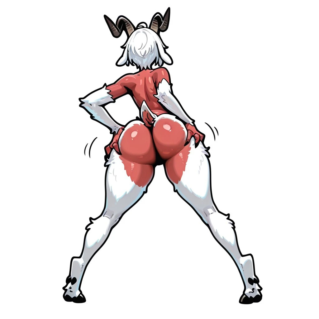 goat girl,skinny,white hair,short hair,goat ears,goat legs,red skin,white fur,white leg fur,white arm fur,black horns,goat horns,white eyebrows,yellow eyes,horizontal pupils,small breasts,goat tail,black nipples,sharp fingernails,black nails,red hands,four fingers,hooves,
