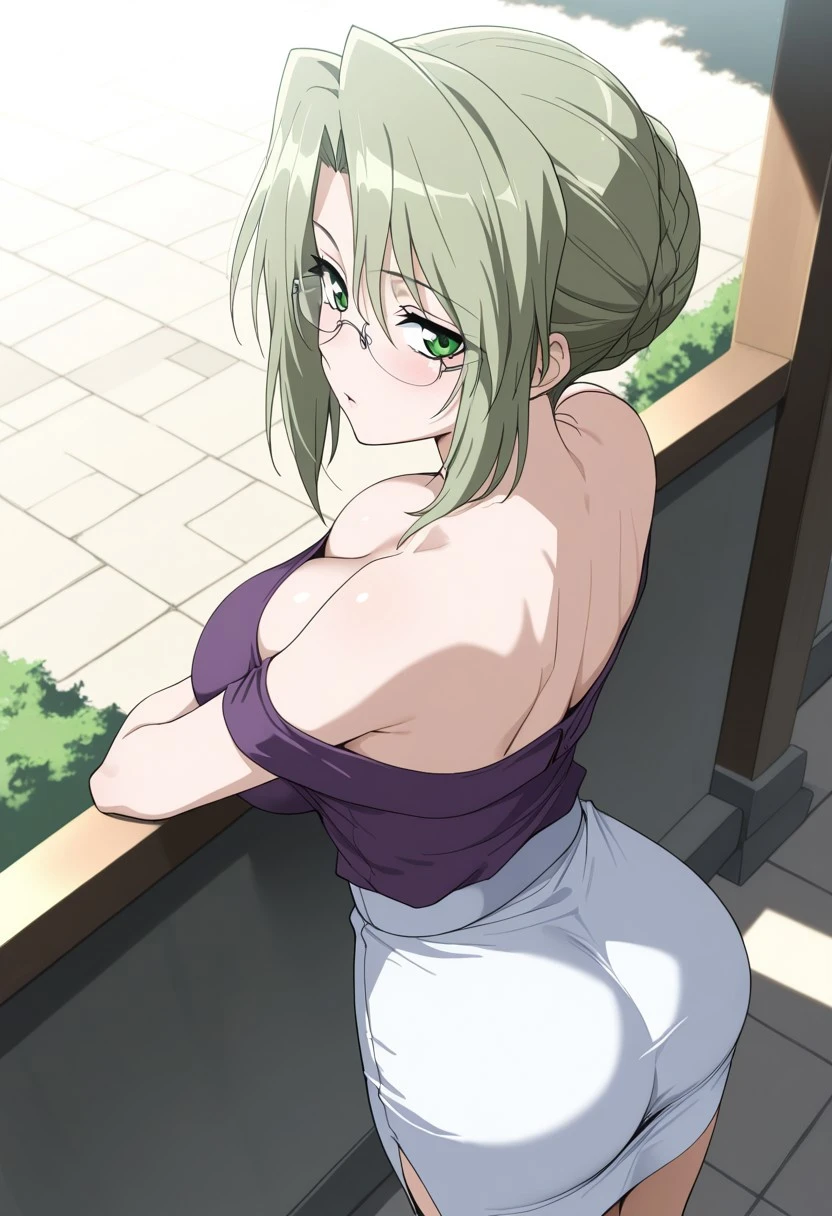 Trigger: Sae_Kisaragi, Light olive hair, green eyes, sidelocks, short hair, glasses, mature female, large breasts, lipstick, official style,