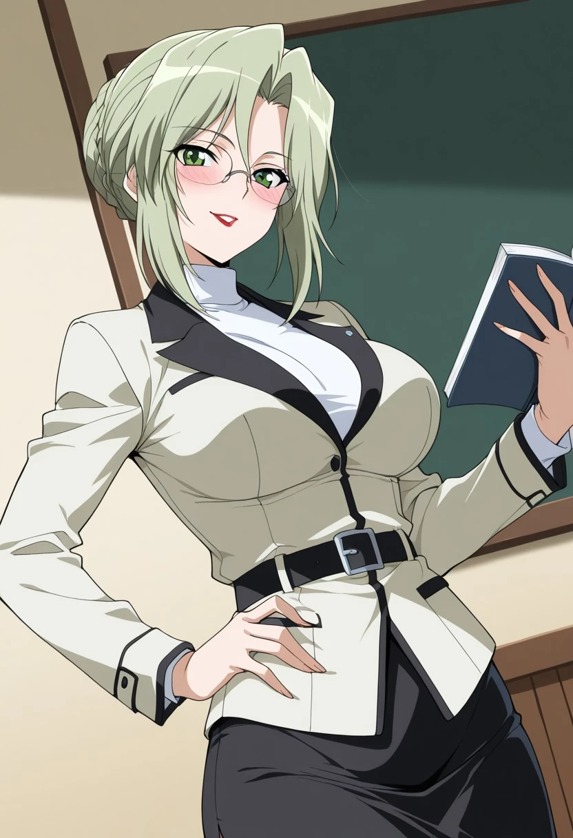 Sae_Kisaragi, Light olive hair, green eyes, sidelocks, short hair, glasses, mature female, large breasts, lipstick, official style,