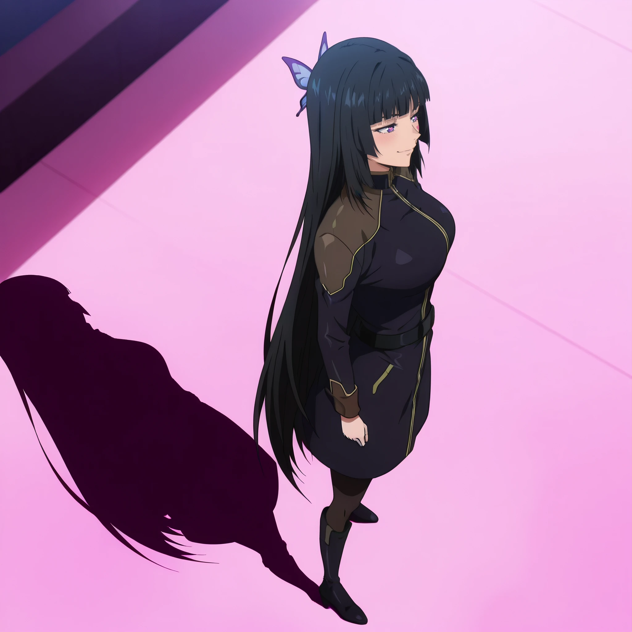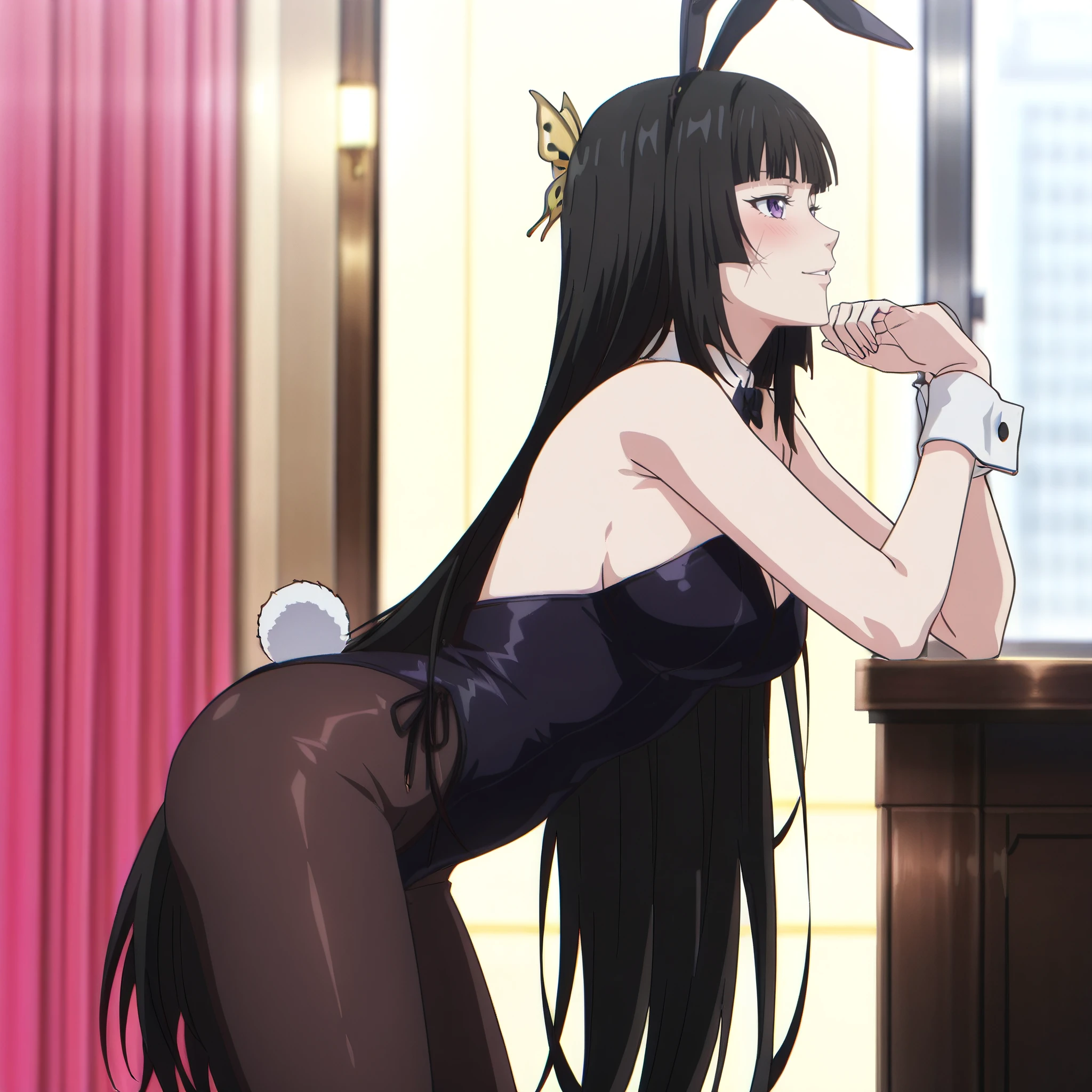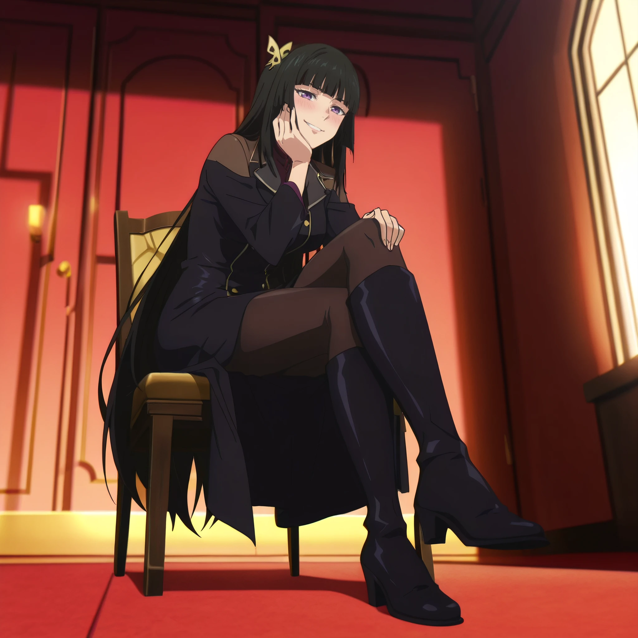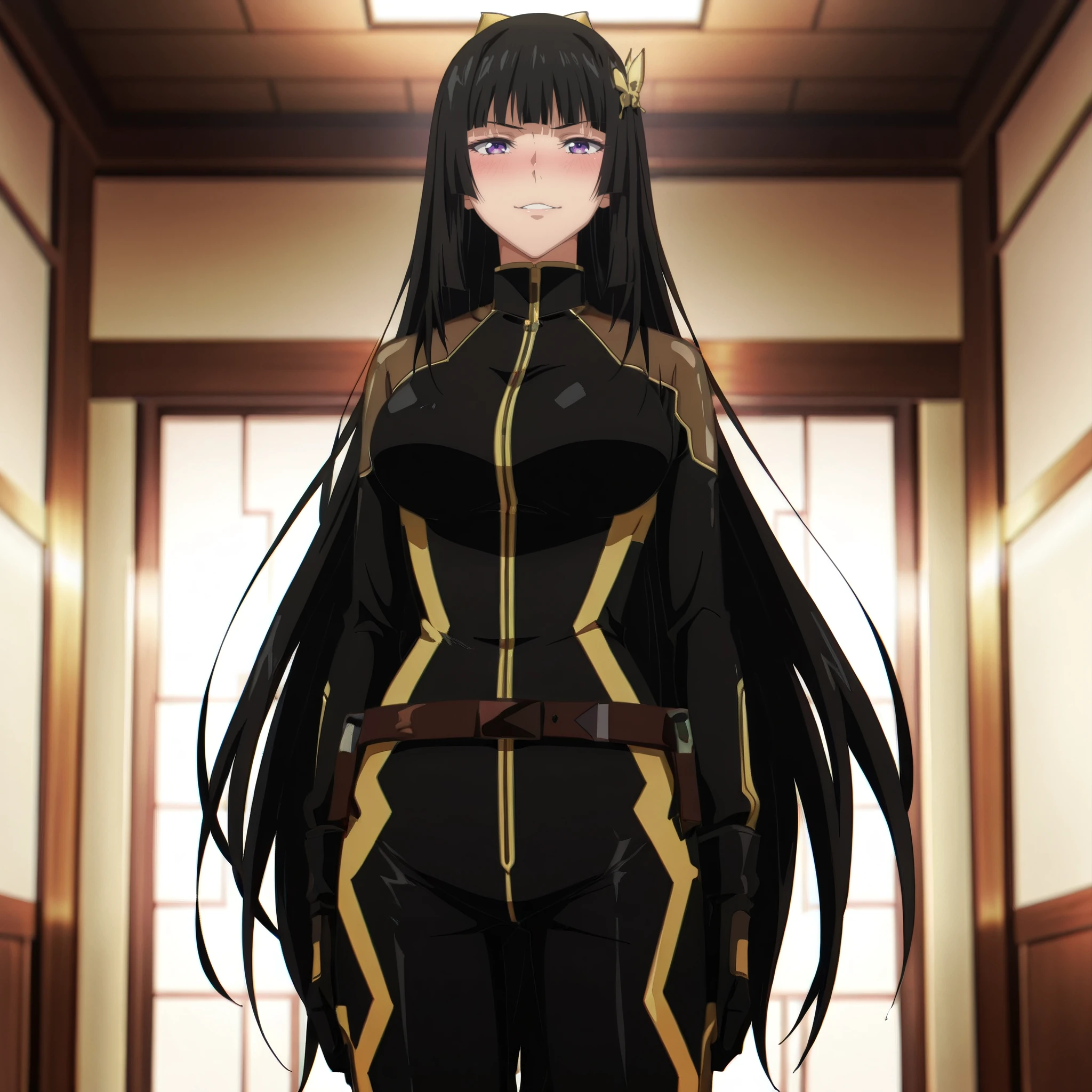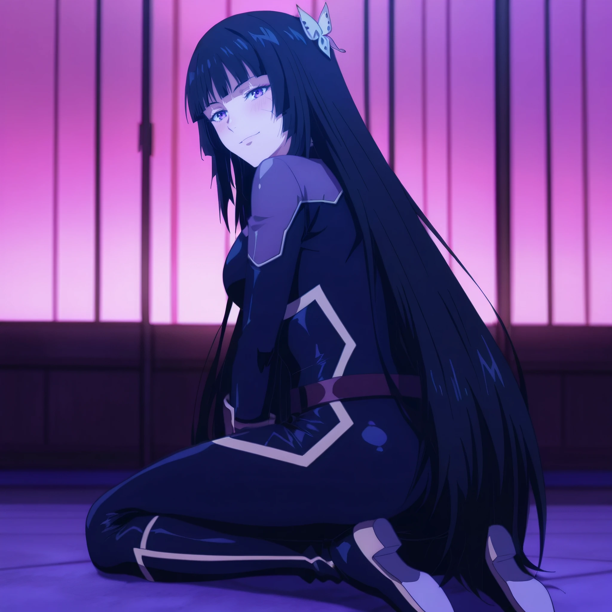 DRMai, purple eyes, black hair, very long hair, blunt bangs, hime cut, butterfly hair ornament, yellow hair ornament,