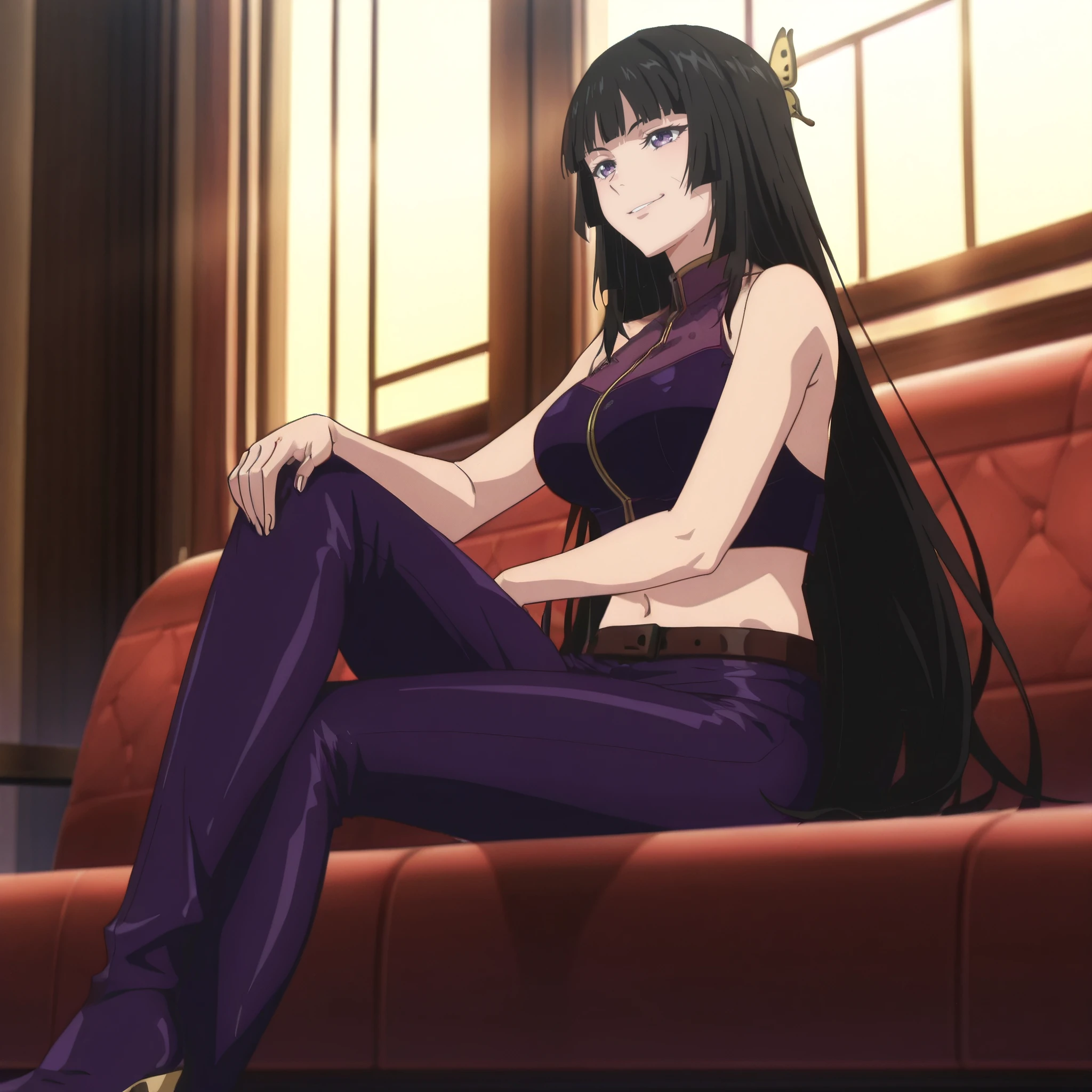 MaiCroptop, purple pants, purple crop top, midriff, belt, bare shoulders, sleeveless, navel,