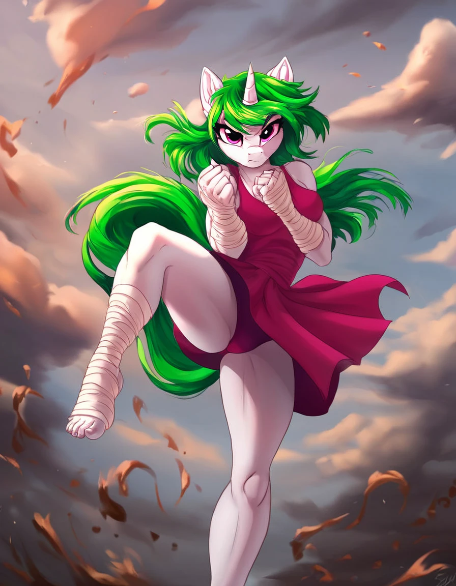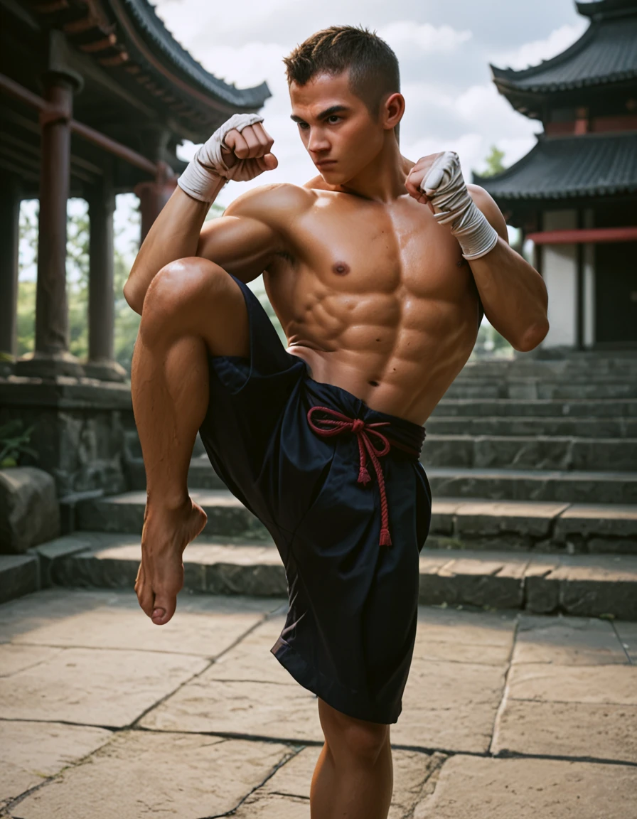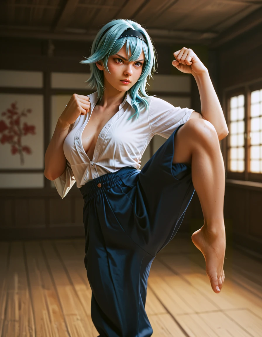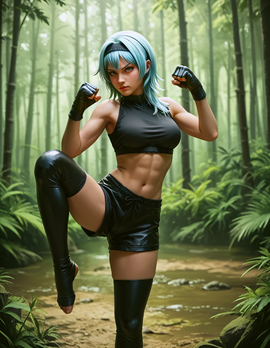 Crazy shit variation: leg kick fighting stance, incoming attack, ((mid air, dynamic, motion blur, blood splashes))