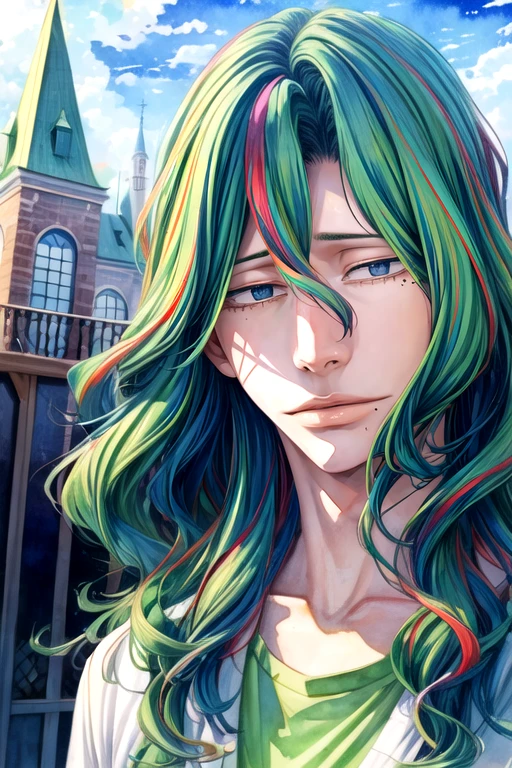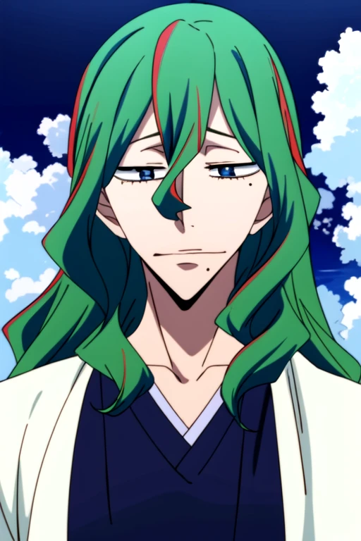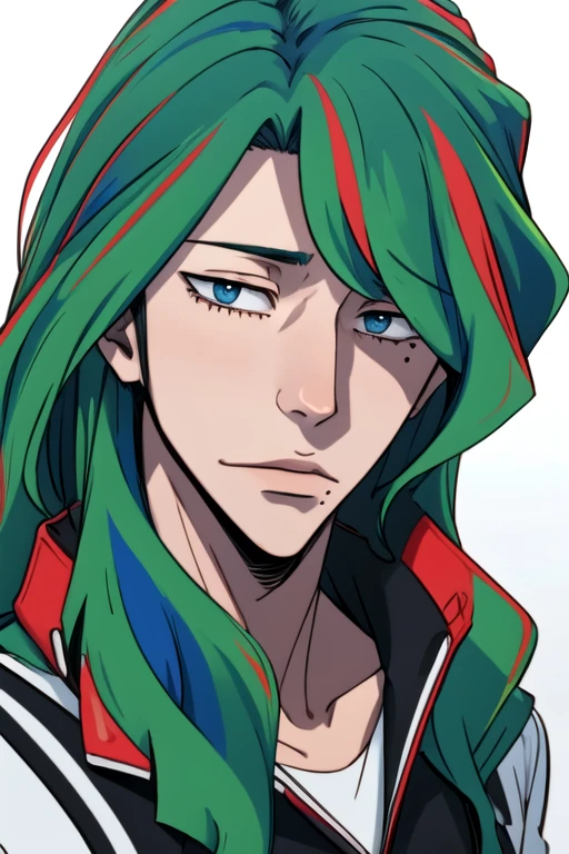 yuusuke_makishima, green hair, blue eyes, long hair, multicolored hair, streaked hair, red hair, hair between eyes, mole, mole under mouth, mole under eye
