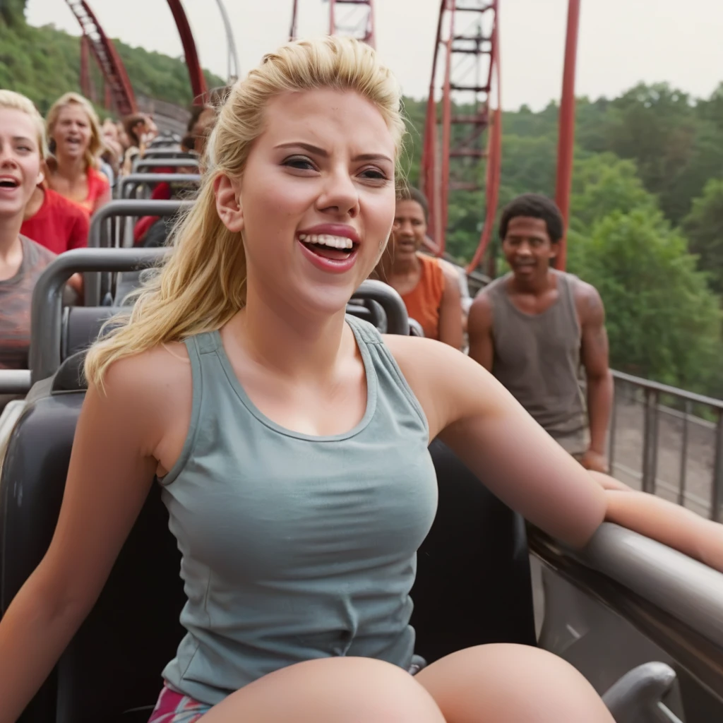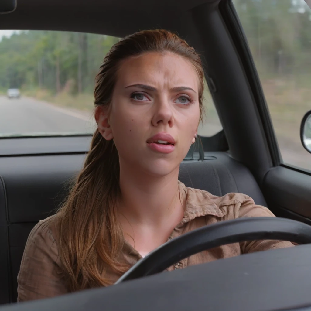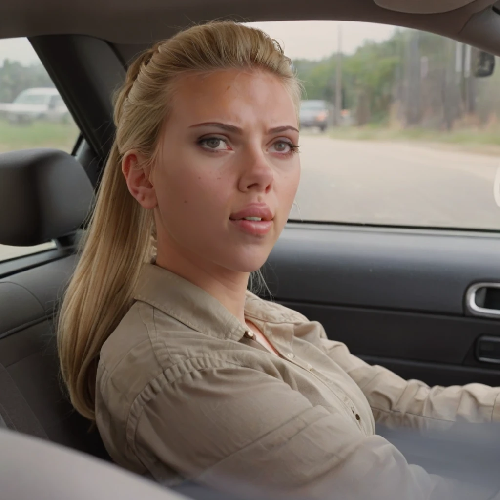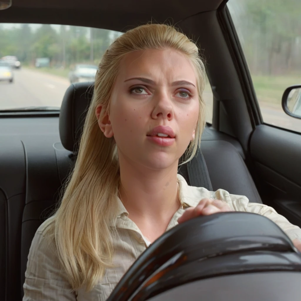 The default scarjo comes out red hair and looking not much like her. It's important to use keywords like "blonde", "half body shot" and maybe something like "ponytail" / "pigtails" if you don't like the default hair.