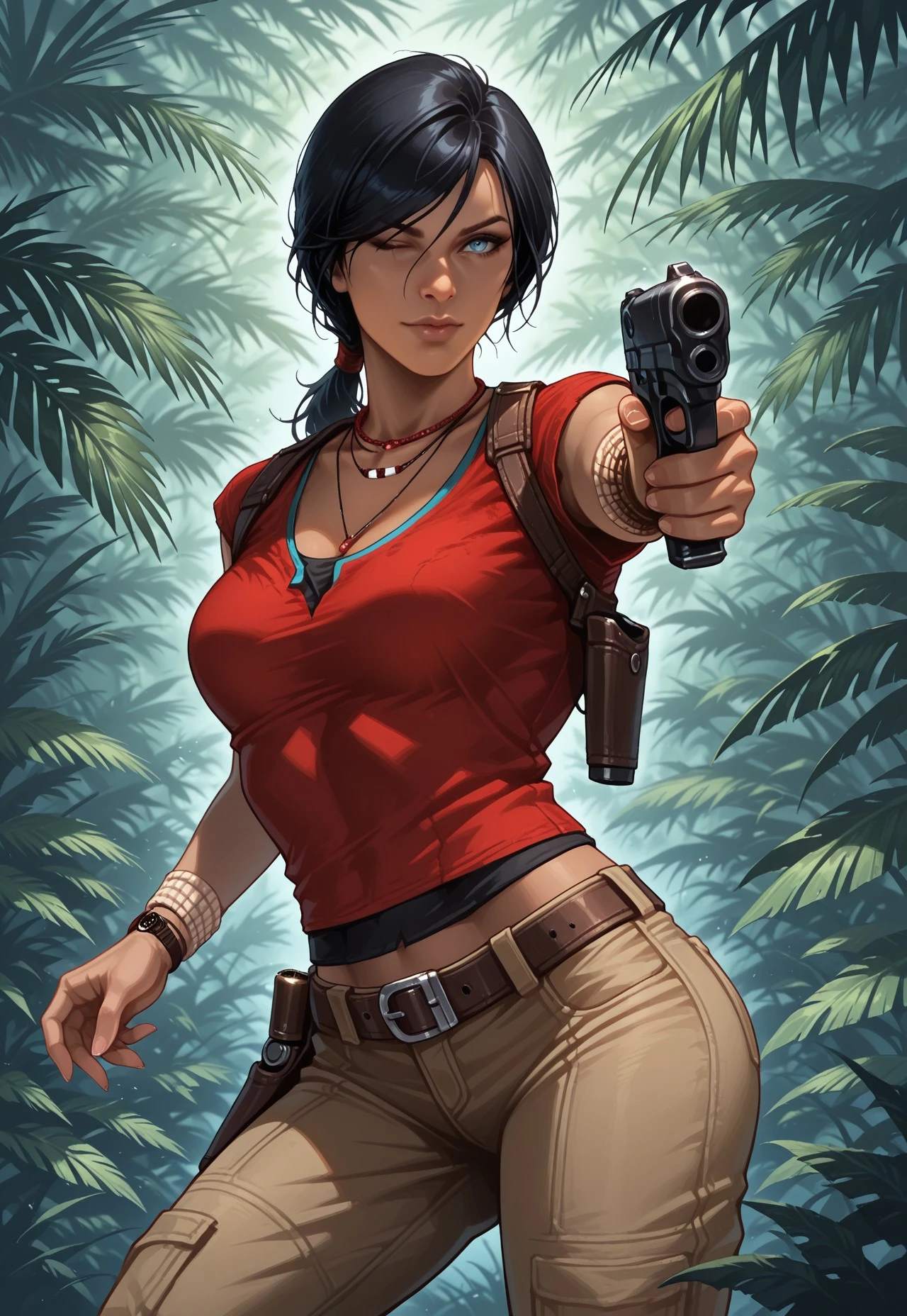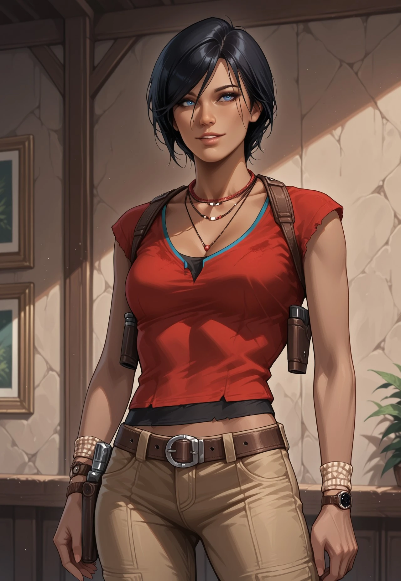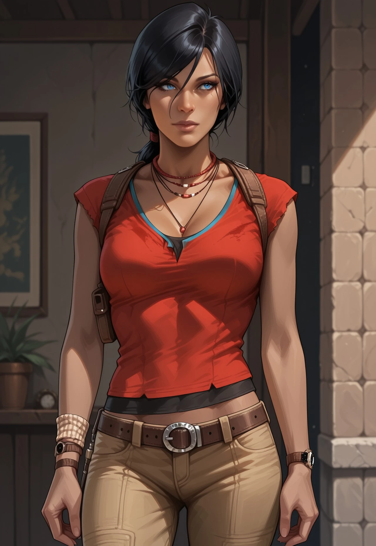 Chloe frazer as she appears in uncharted 2. The smooth talking femme semi-fatale who is mostly allied with Drake. She would go on to briefly appear in uncharted 3 and take center stage in Uncharted: Lost Legacy.