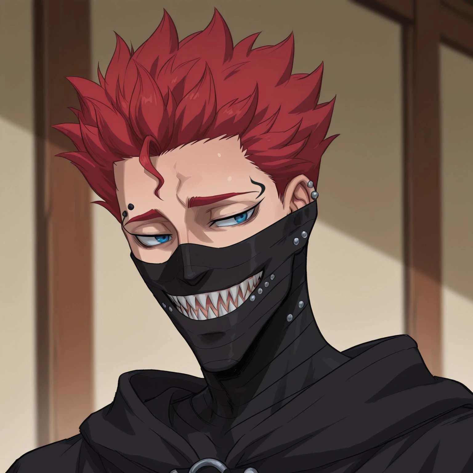 zora ideale, red hair, spiked hair, short hair, blue eyes, black mask, piercing, facial mark, sharp teeth