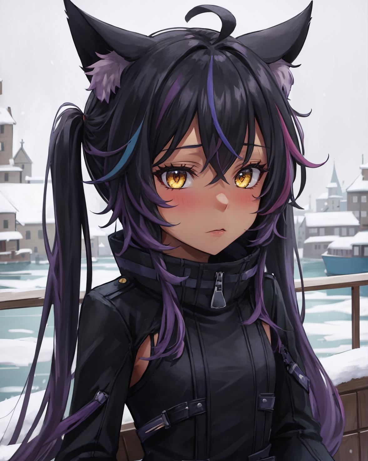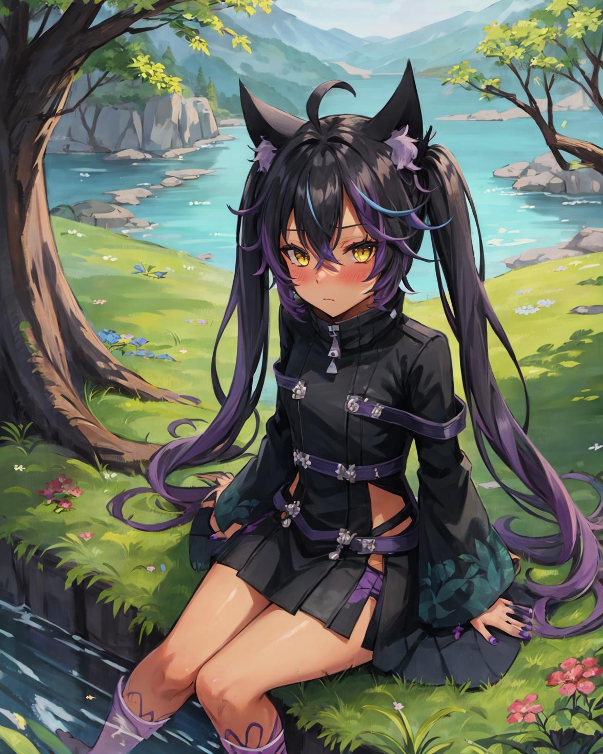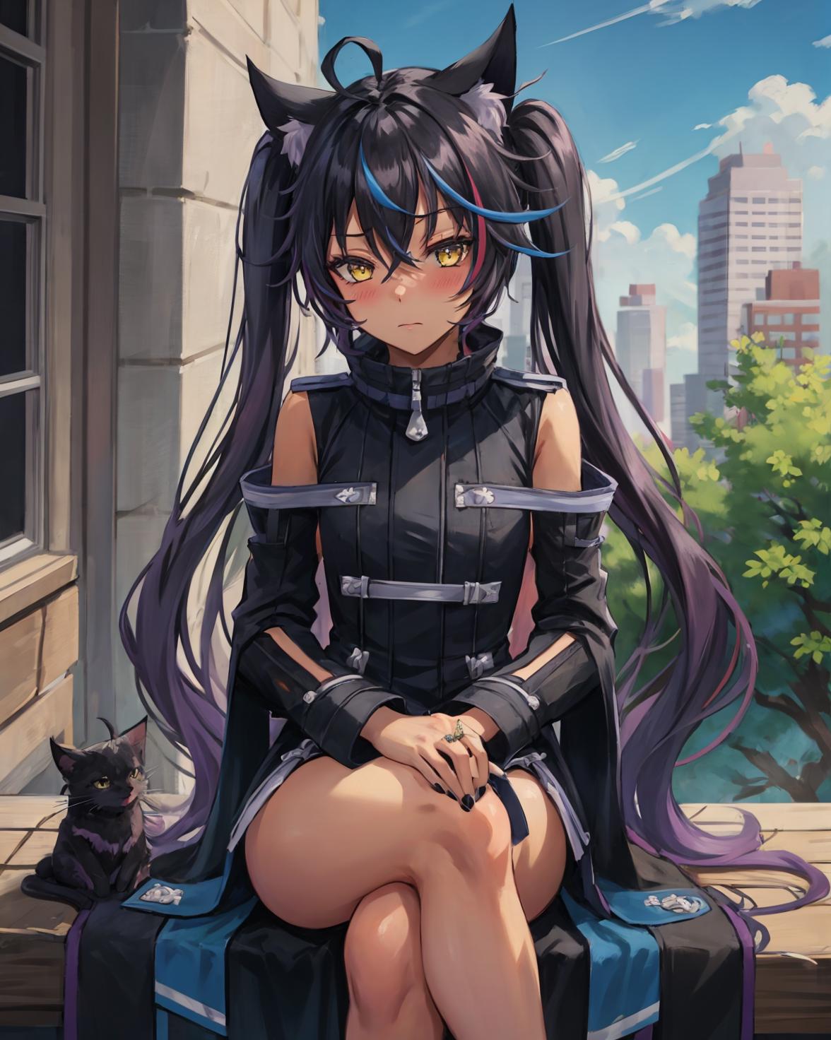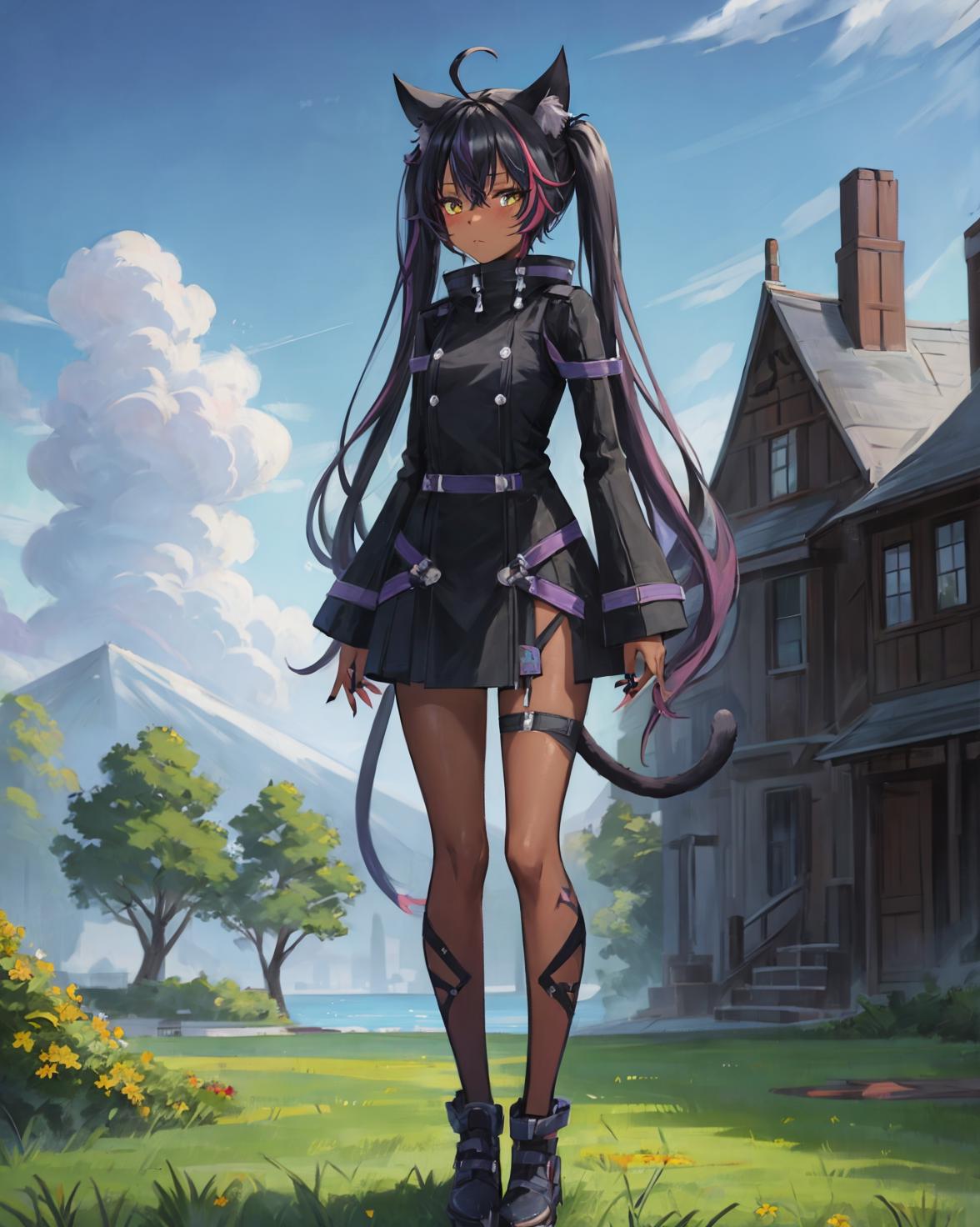 <lora:Celine:0.85>, Celine Millstein, black hair, purple hair, streaked hair, ahoge, long hair, black cat ears, twintails, cat tail, dark skin, small breasts,