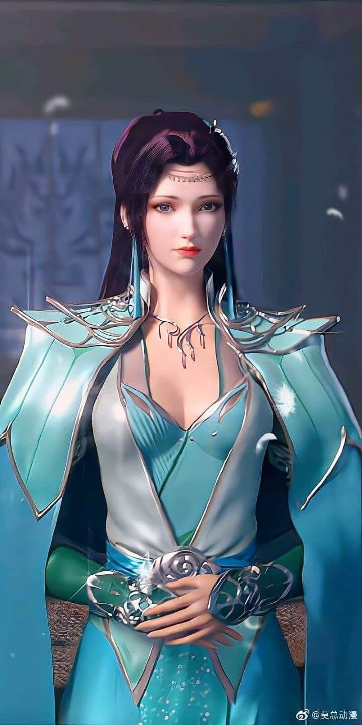 YunYun, 1girl, long hair, jewelry, solo, dress, earrings, hair ornament, expressionless, brown hair, necklace, black hair, looking at viewer, blue dress, purple hair,
