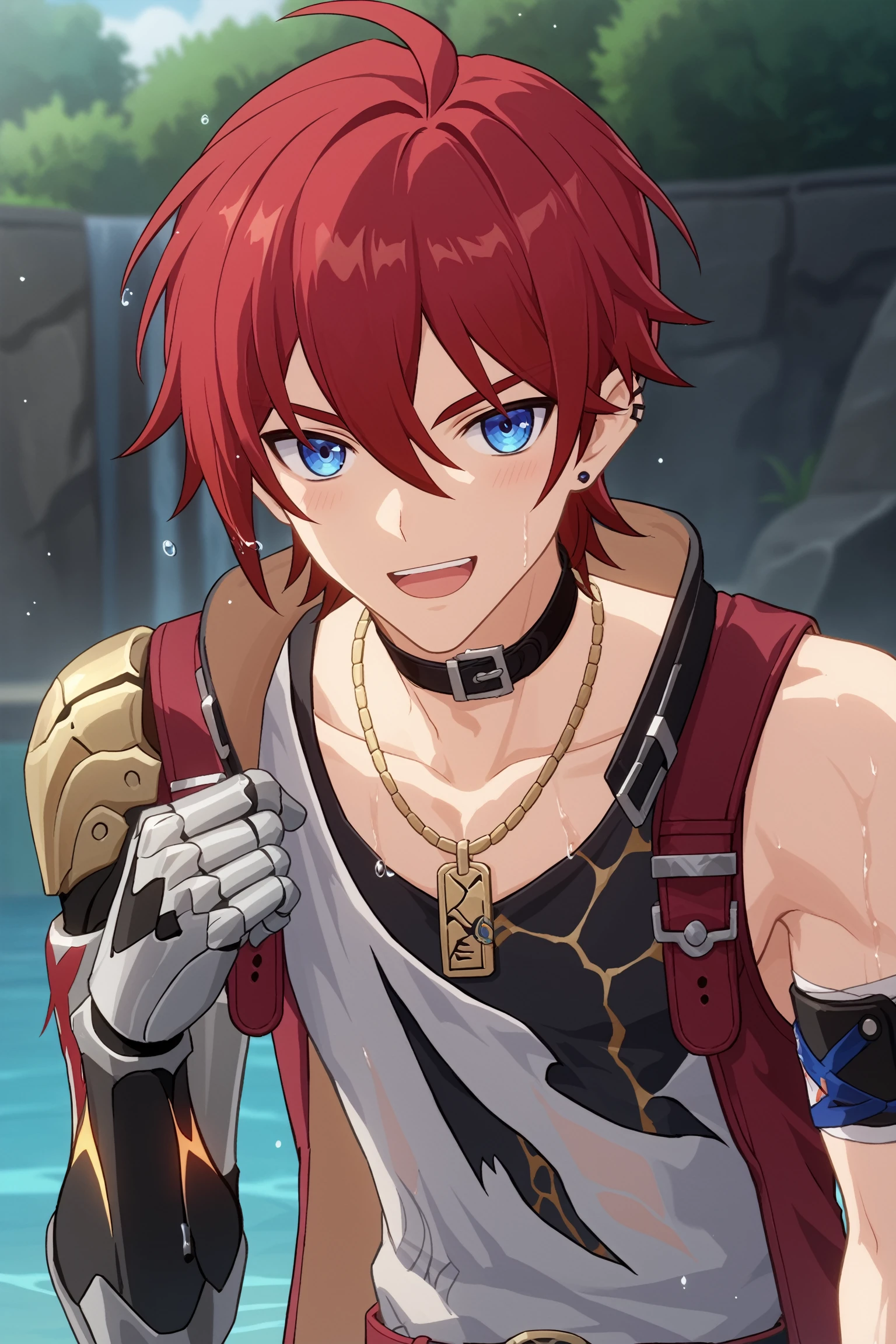 luka, red hair, ponytail, blue eyes, mechanical arm