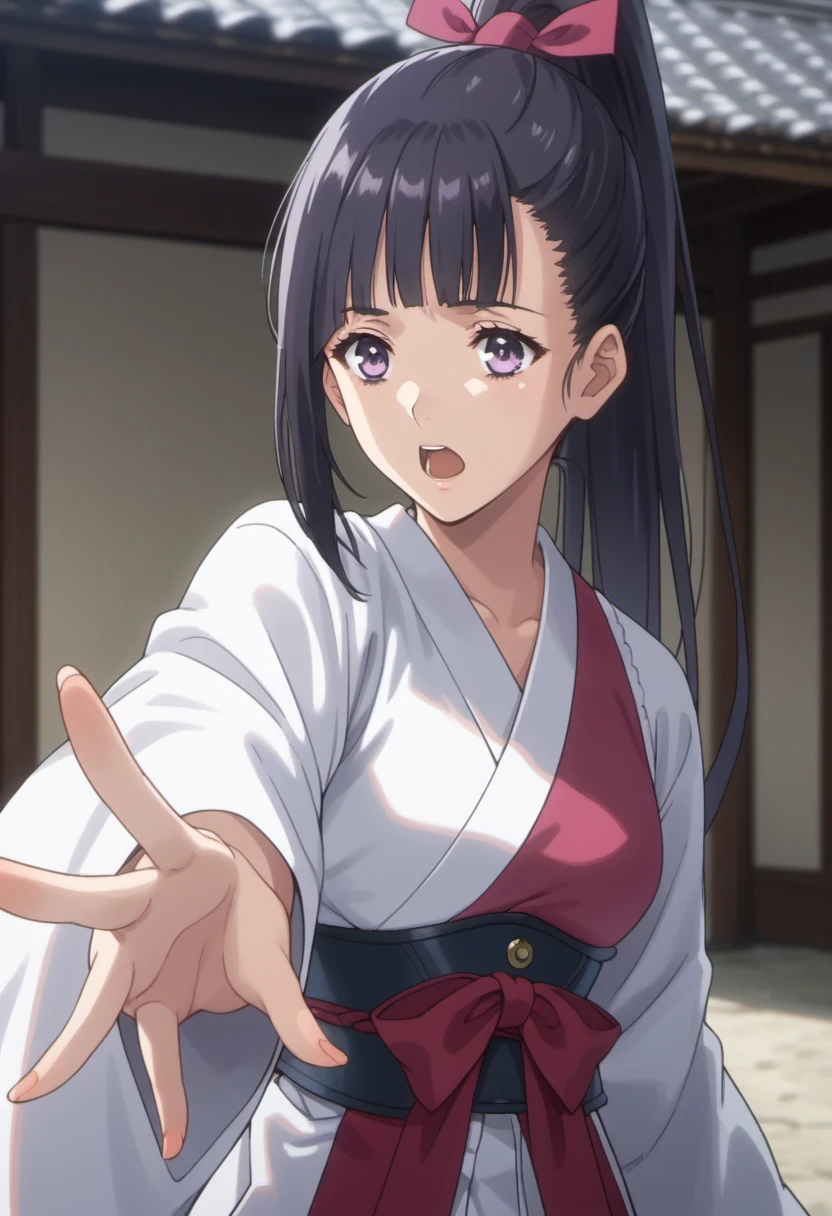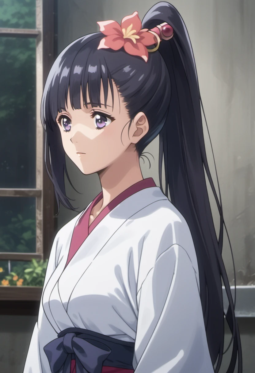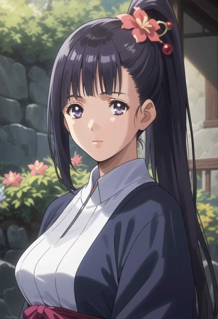 Trigger Words: yomogawa ayame, long hair, black hair, ponytail, purple eyes