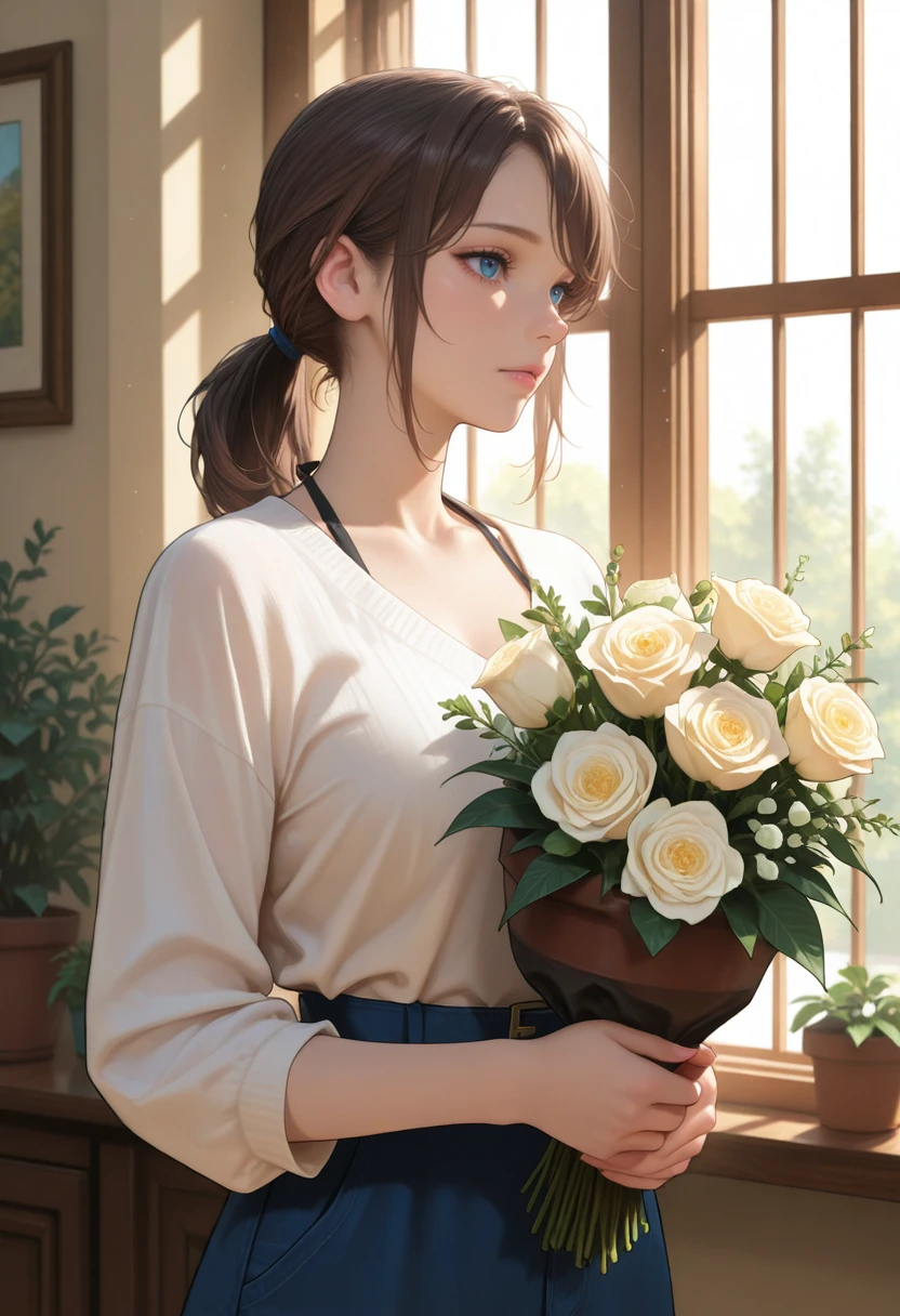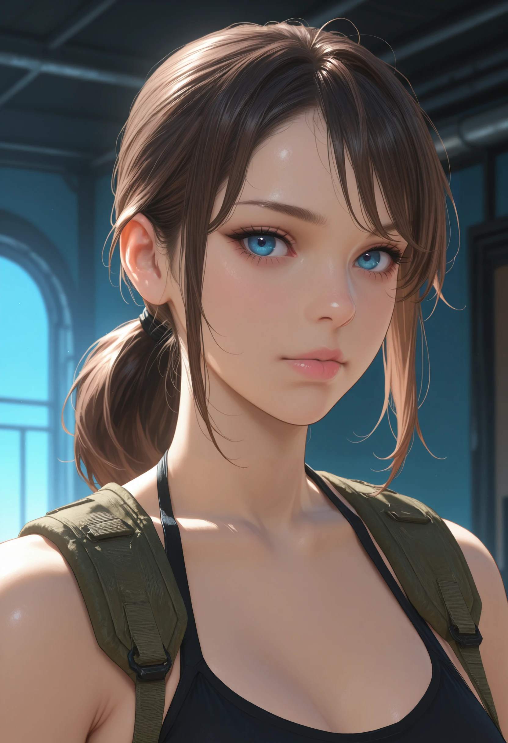 MGSQuiet, 1girl, blue eyes, brown hair, ponytail