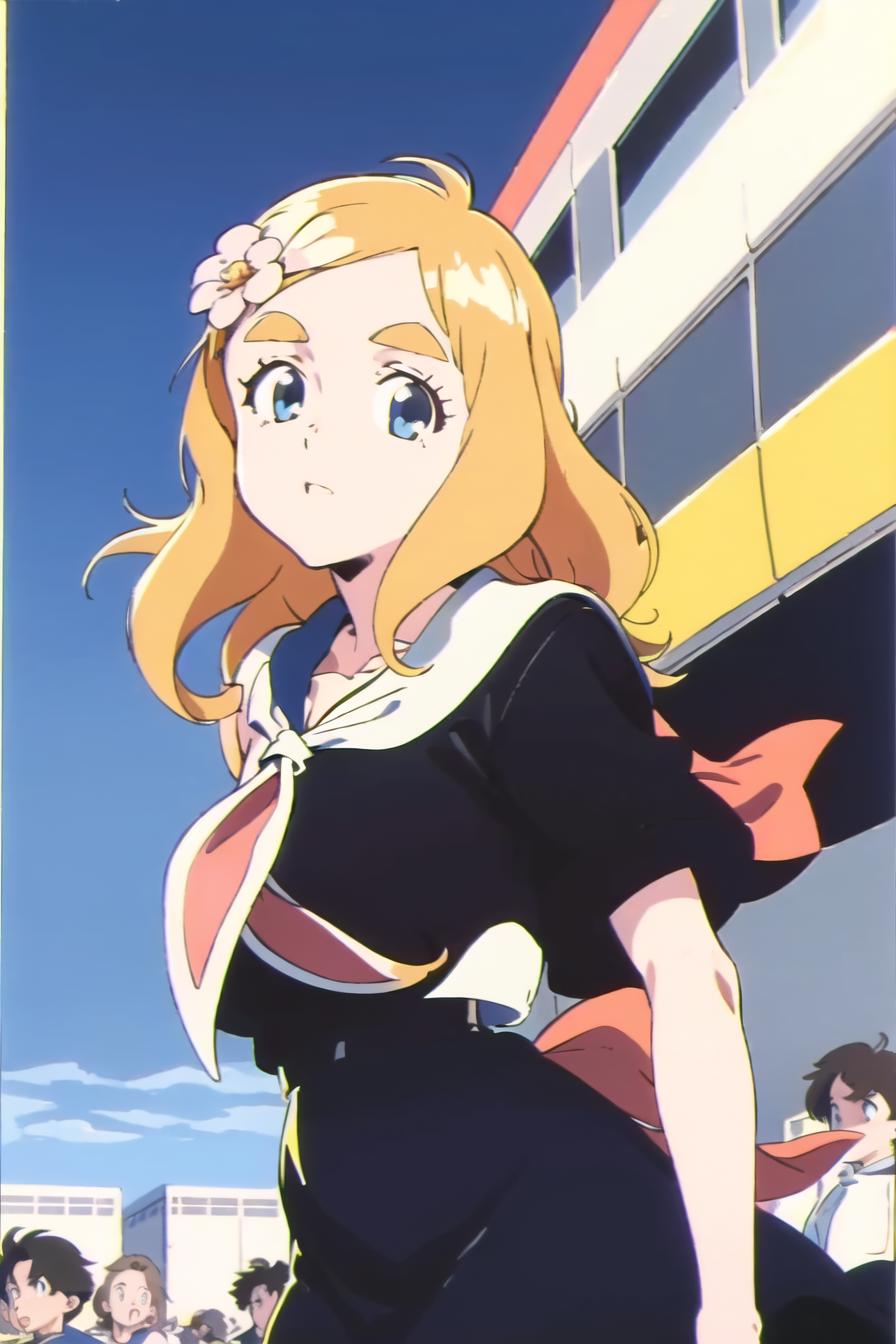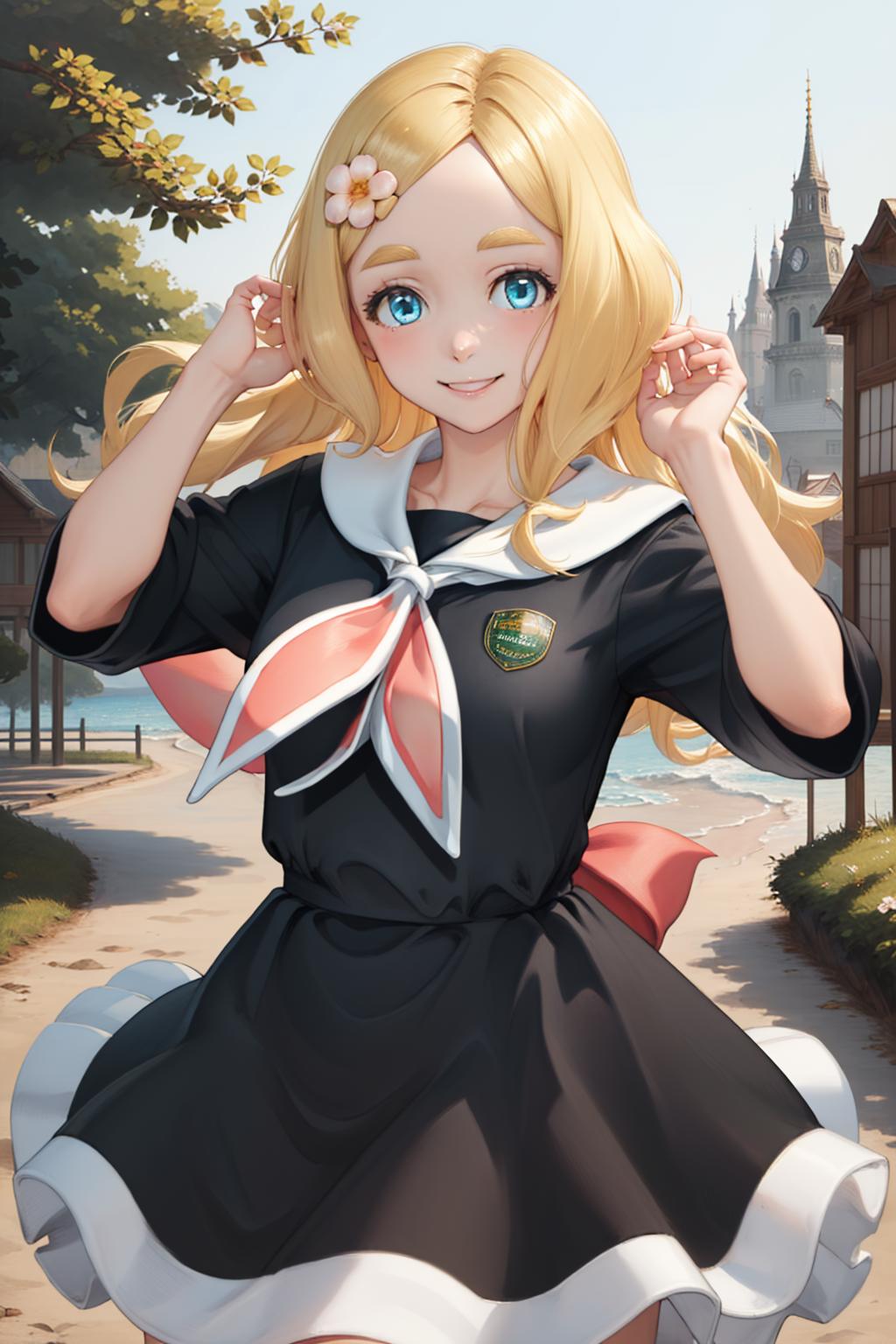 Trigger + Appearance: shinonome megu, hair flower, blue eyes, thick eyebrows