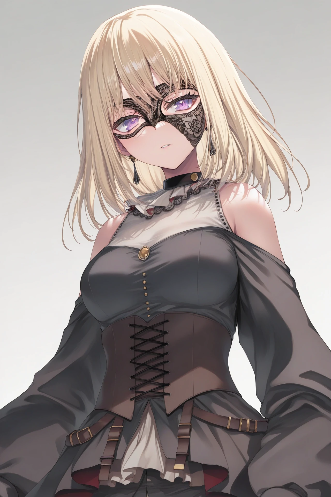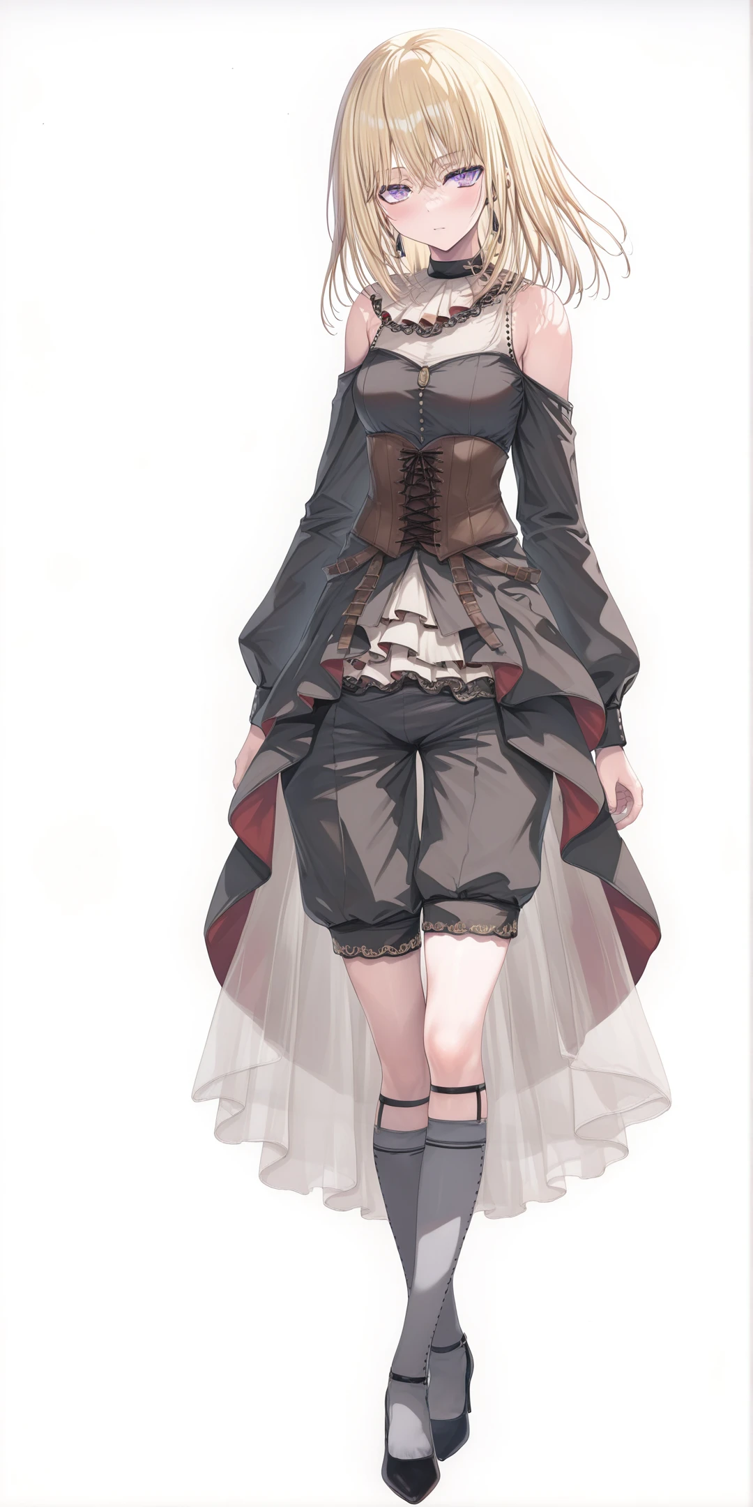 blonde hair, purple eyes, medium hair,long sleeves, black shorts, black dress, dress, see-through, grey socks,kneehighs,black high heels, off shoulders, black pants, corset, choker, ascot,gold_trim, black earrings, jewelry,